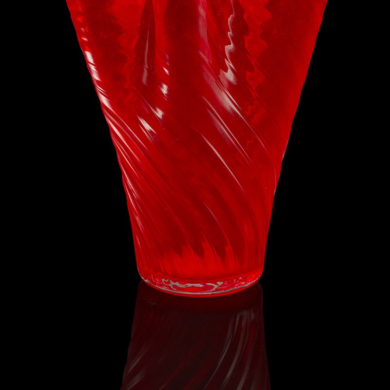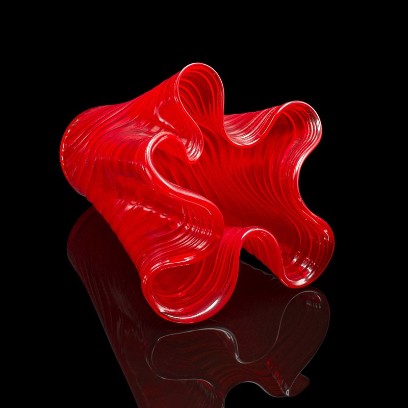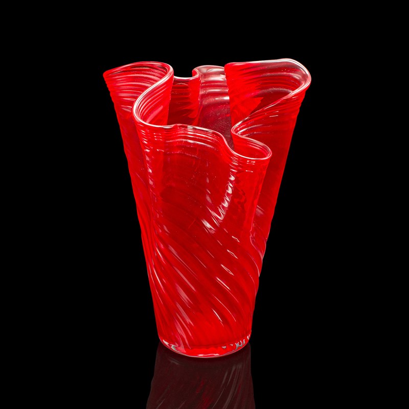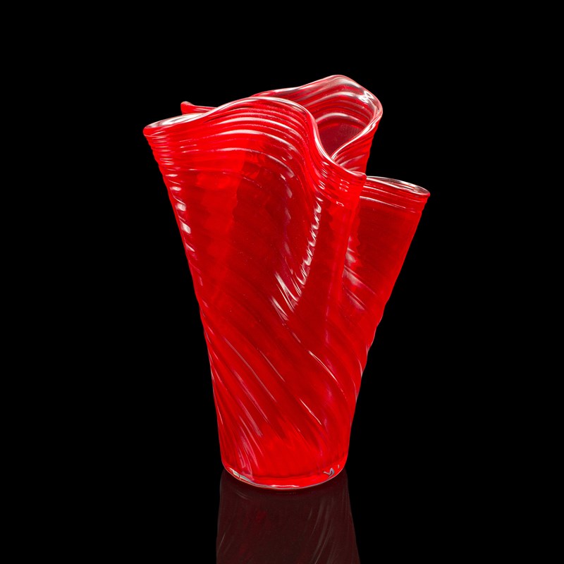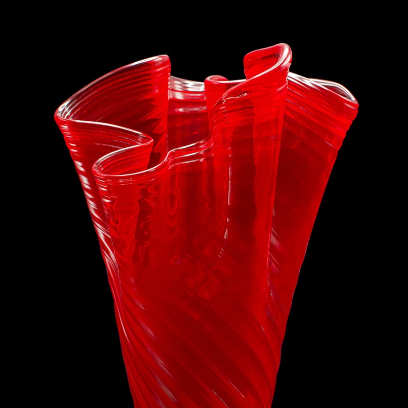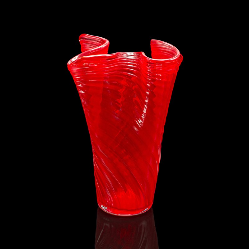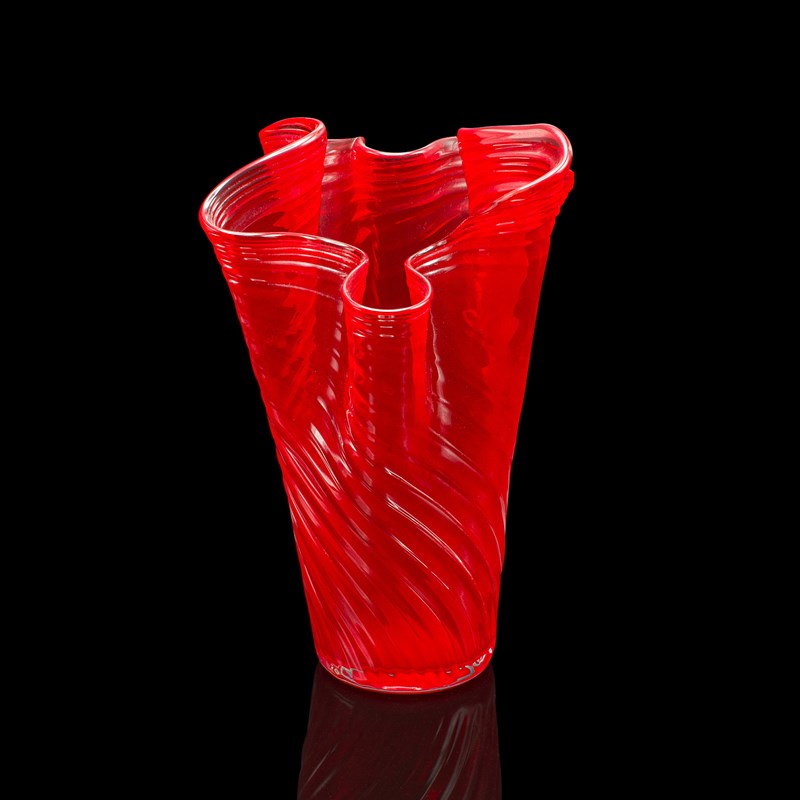 This exceptional piece of Italian art glass captivates with its vibrant scarlet red hue and dramatic ‘napkin’ form, showcasing superb craftsmanship and artistry. The billowing curvature and tactile ridged finish enhance its sculptural presence, making it ideal as a decorative centrepiece or flower sleeve.