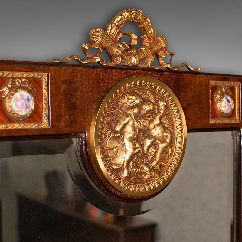 Prominent gilt metal details, with a striking laurel wreath pediment over a relief medallion of playful cherubs