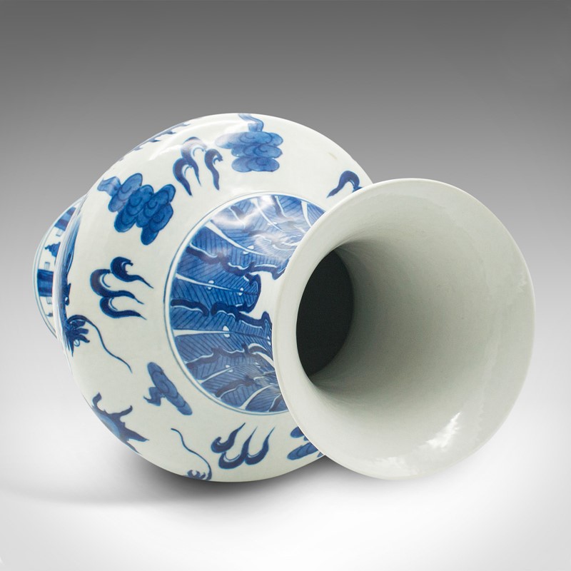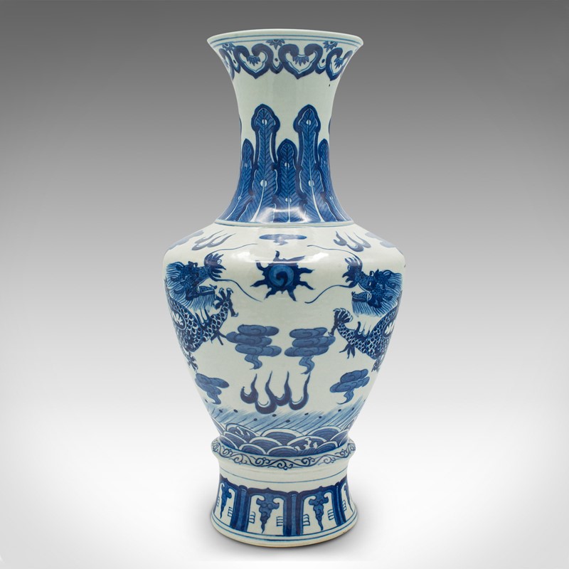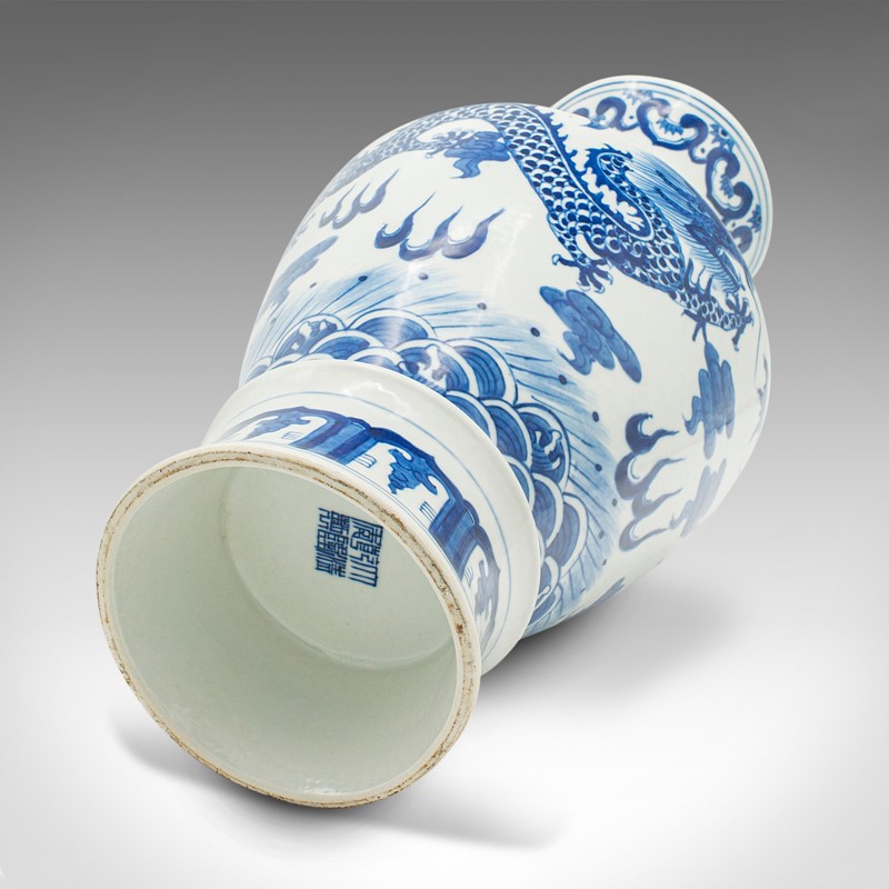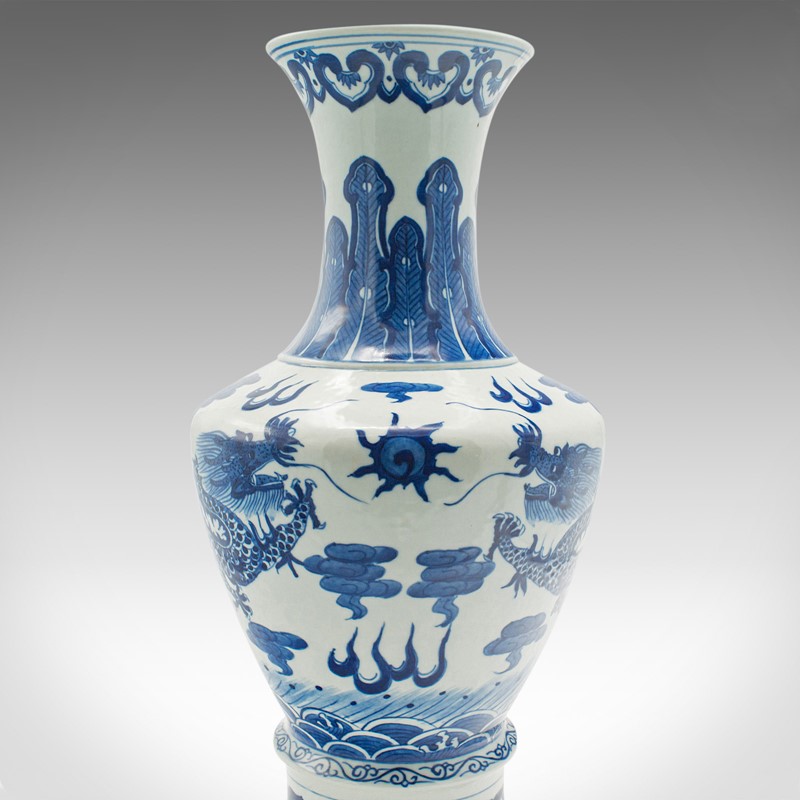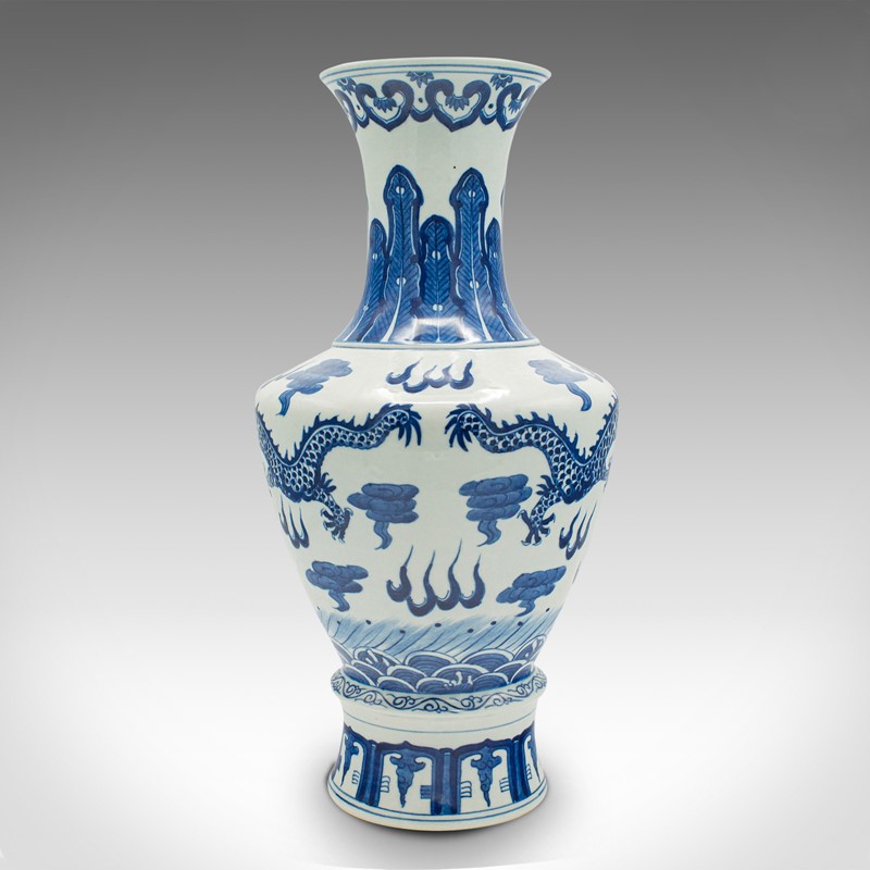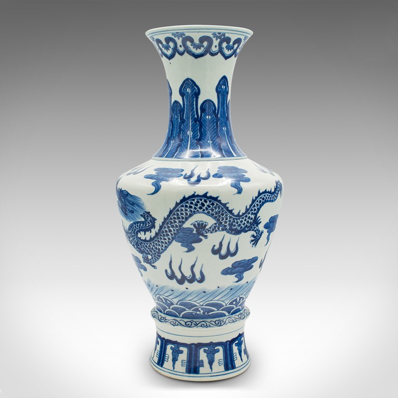 This is a distinctive vintage white and blue vase, with superb Chinese dragon decor. Delivered polished and ready to display.