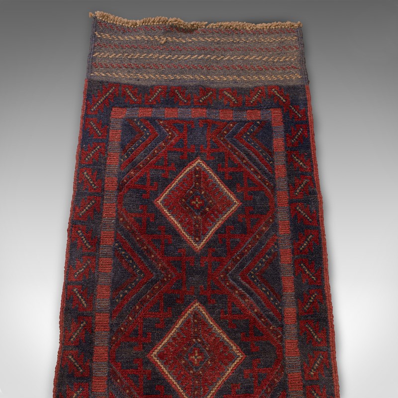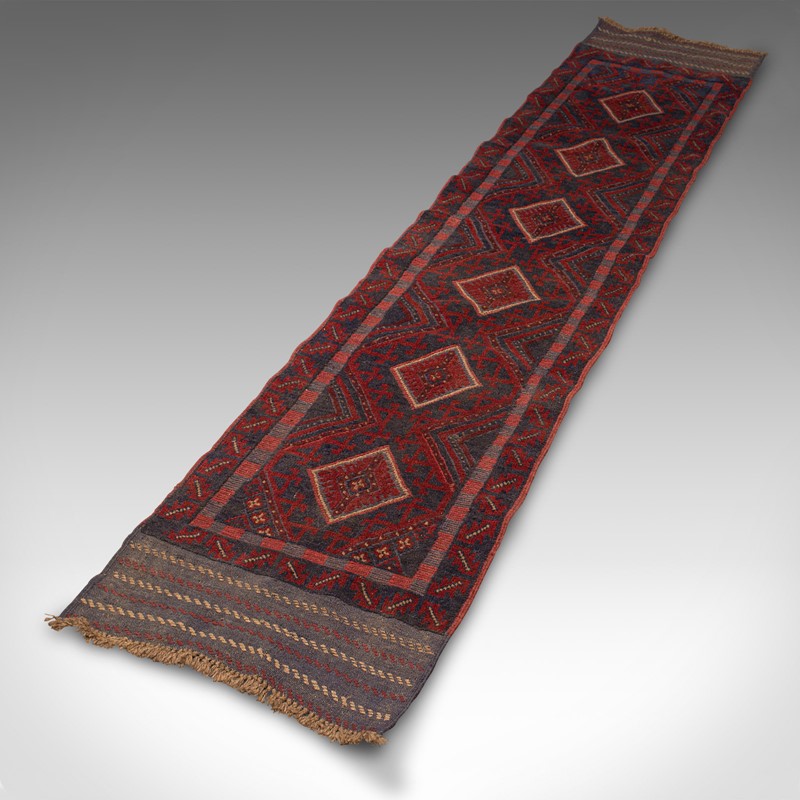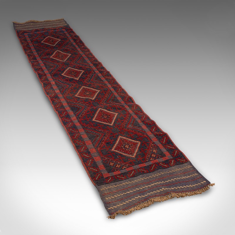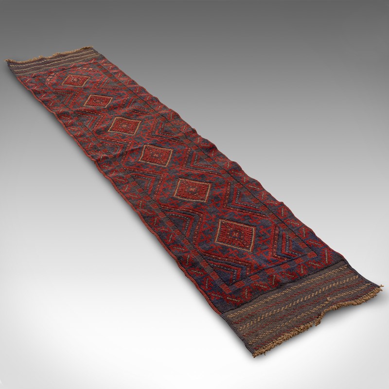 This is a long vintage Meshwari runner. A Persian, hand woven wool and kilim hallway carpet, dating to the early 20th century, circa 1930.