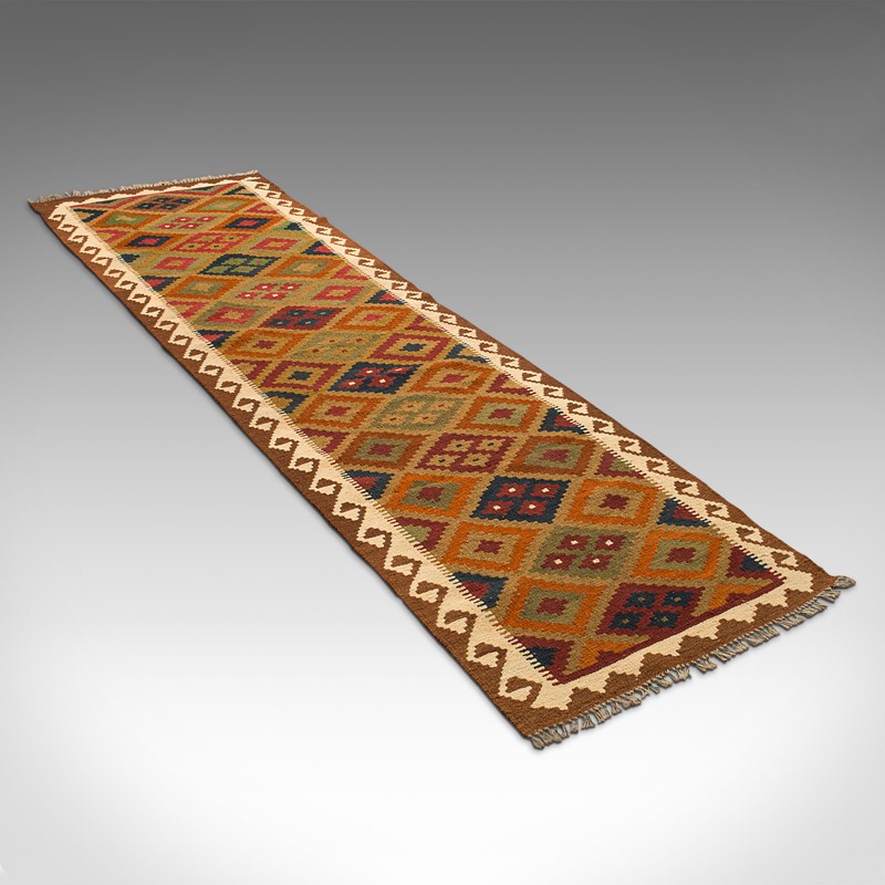 This is an attractive vintage Maimana Kilim runner, with pleasing colour and an eye-catching diamond pattern sure to enhance an entrance hall. Delivered ready to lay.