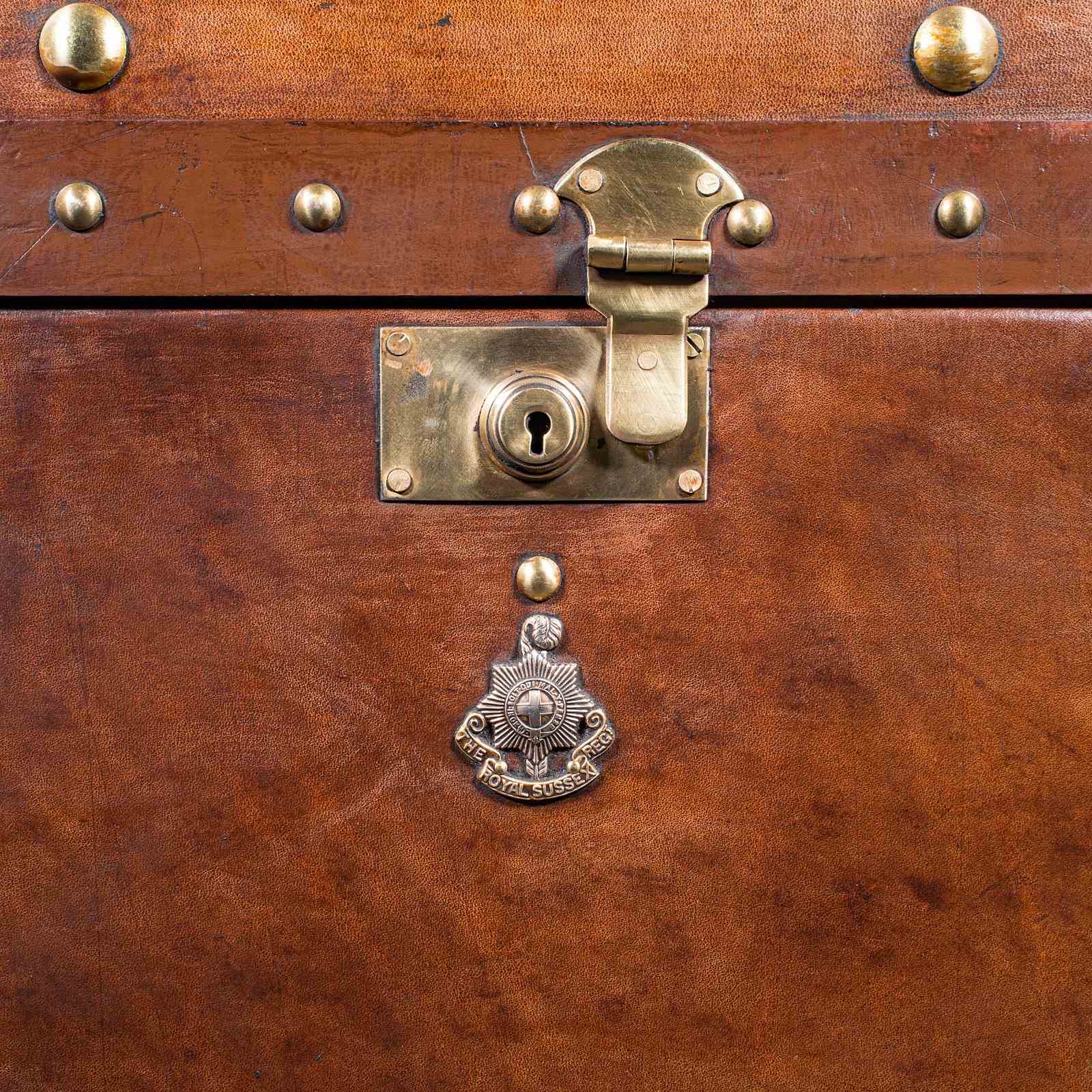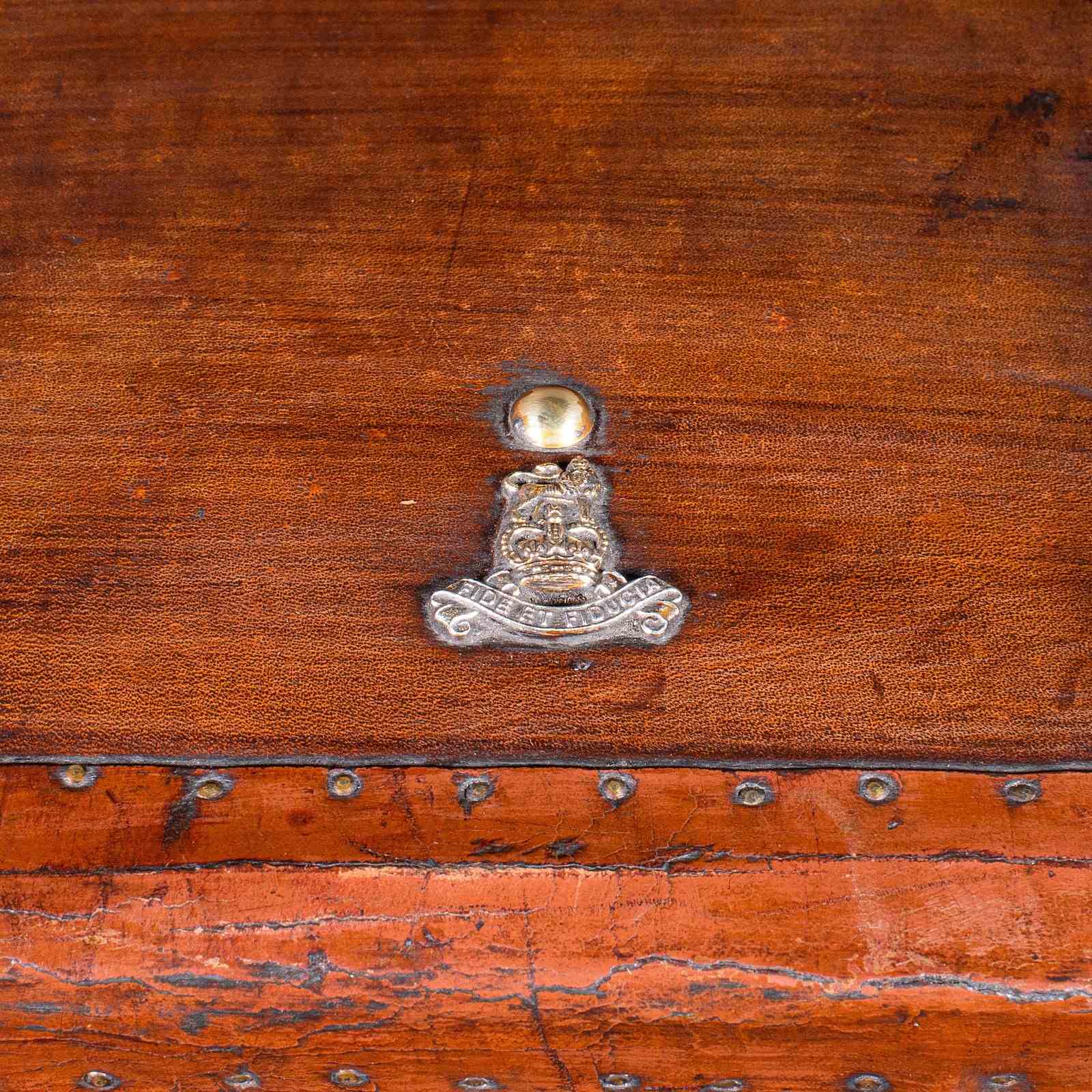 Heraldic Fide et Fiducia brass emblem adorns the lid, Latin for Faith and Trust