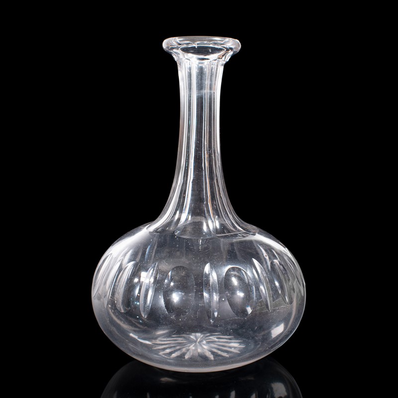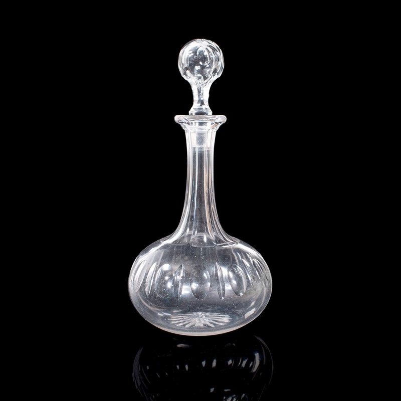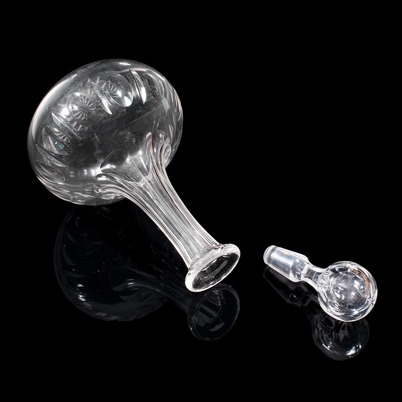 This is a pair of antique decanters with stands. An English, glass vessel and silver plate coaster, dating to the Edwardian period, circa 1910.