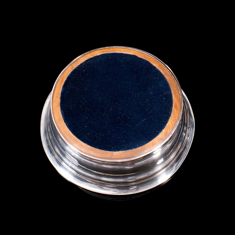 Silver plate stands with beautiful inlaid walnut, beaded detail to edge