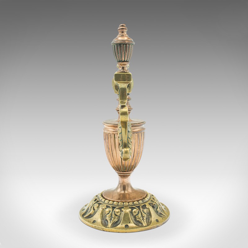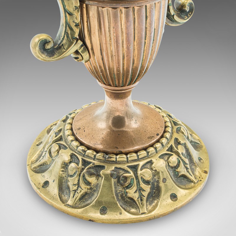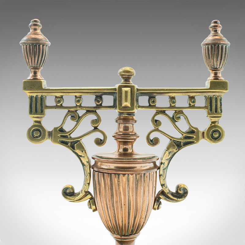 This is a pair of antique decorative tool rests. A Continental, brass and copper fireside stand in the Grand Tour taste, dating to the early Victorian period, circa 1860.