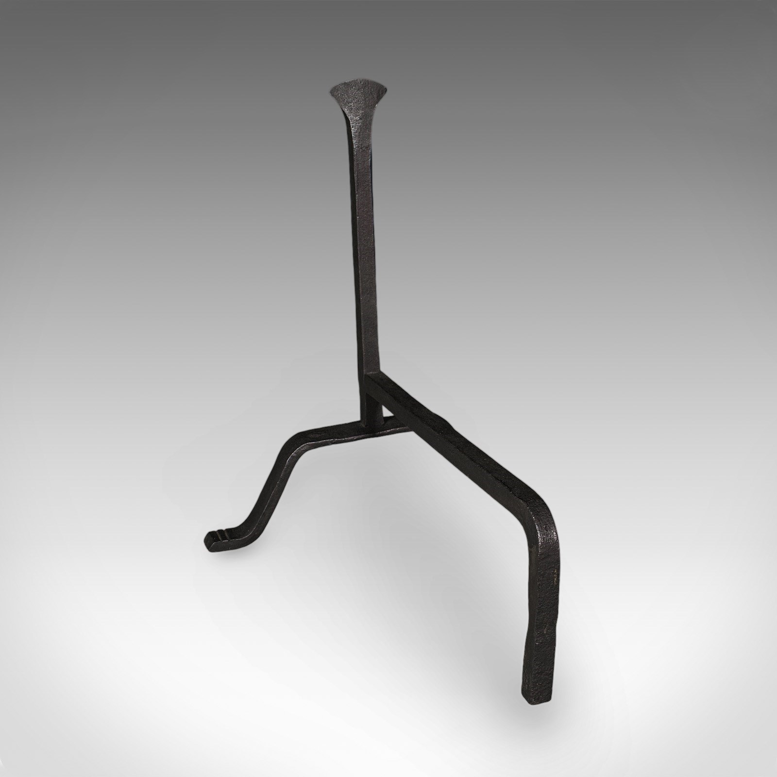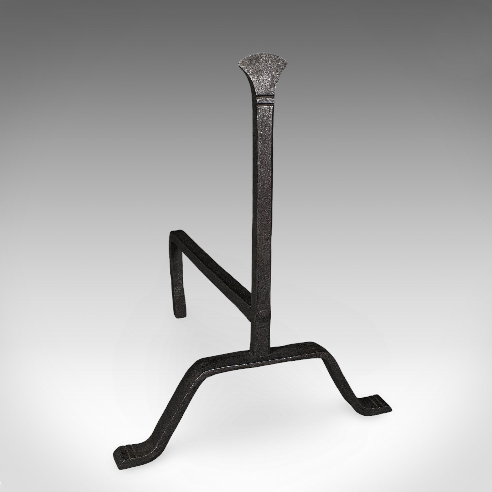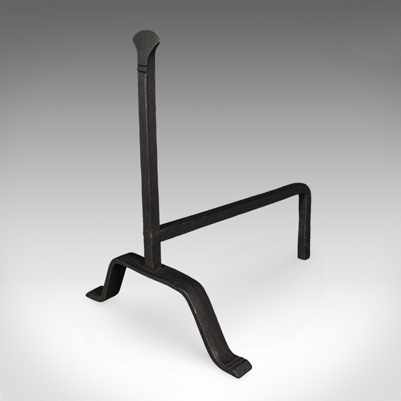 This is a pair of antique fire dogs. An English, wrought iron fireplace andiron, dating to the Victorian period, circa 1900.