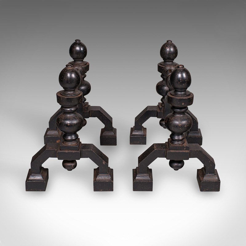 This is a pair of antique tool rests. An English, ebonised cast iron fireside poker stand in Aesthetic Movement taste, dating to the Victorian period, circa 1880. Pleasingly decorative and distinctive, they embody the Art for Art’s Sake reaction to the pragmatic ethos of the Industrial Revolution.