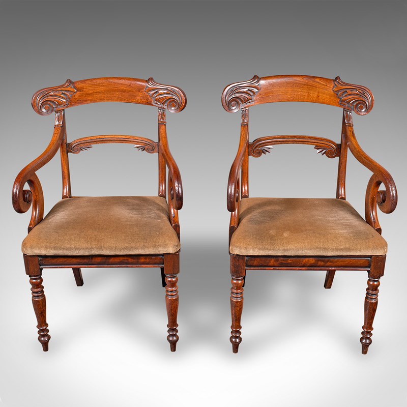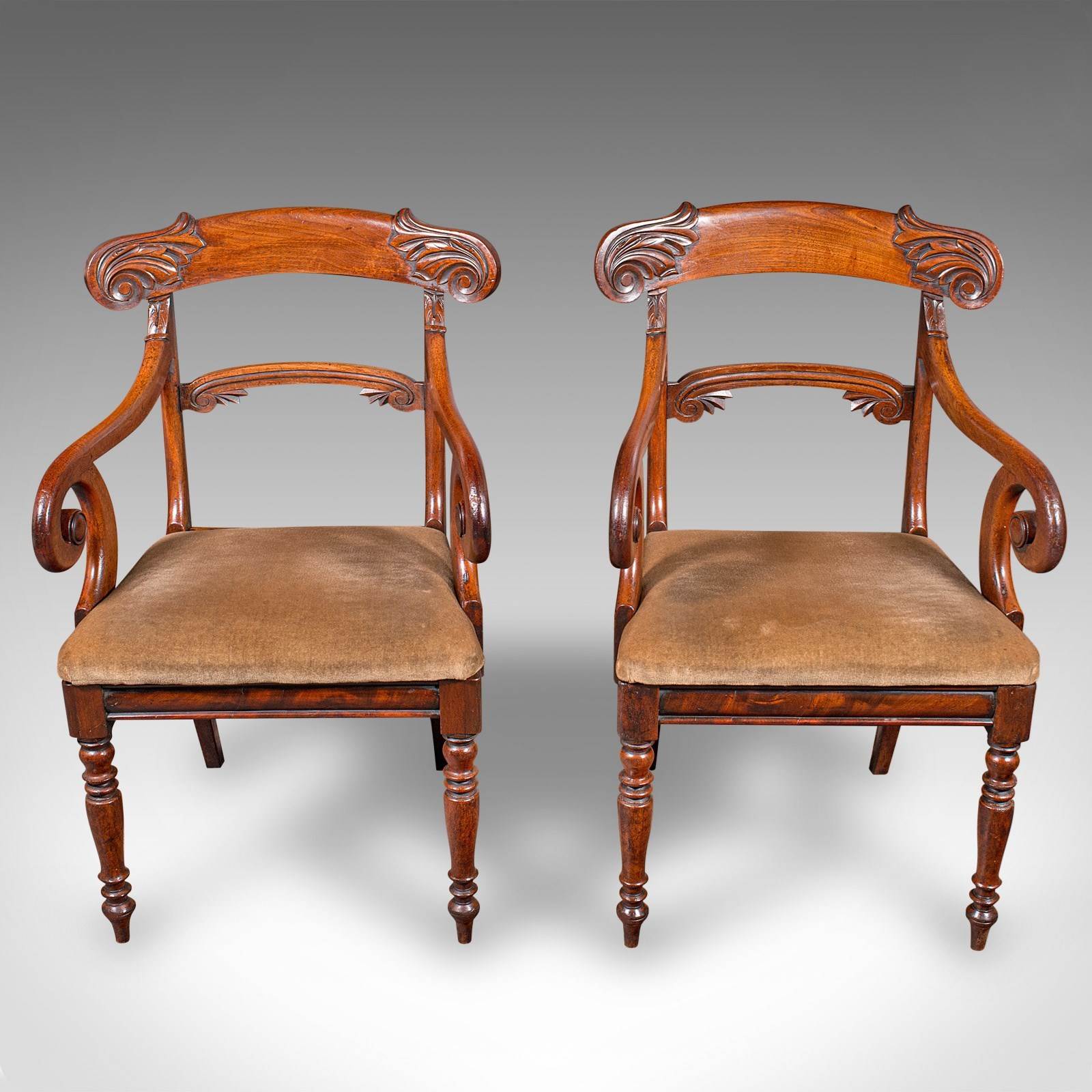 This is a fine pair of antique morning room chairs. An English, mahogany elbow seat, dating to the Regency period, circa 1820. Elegantly proportioned and displaying superb craftsmanship, these chairs offer refined drawing room or reception hall appeal, enriched with decorative carving and graceful form.