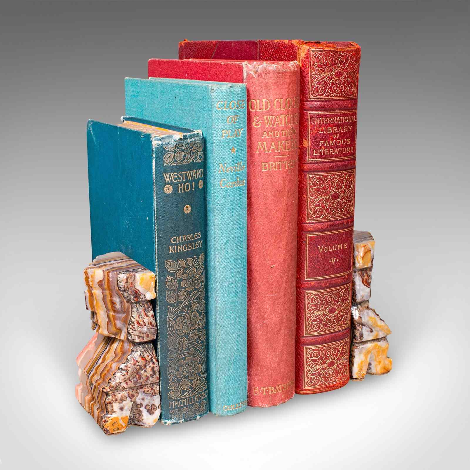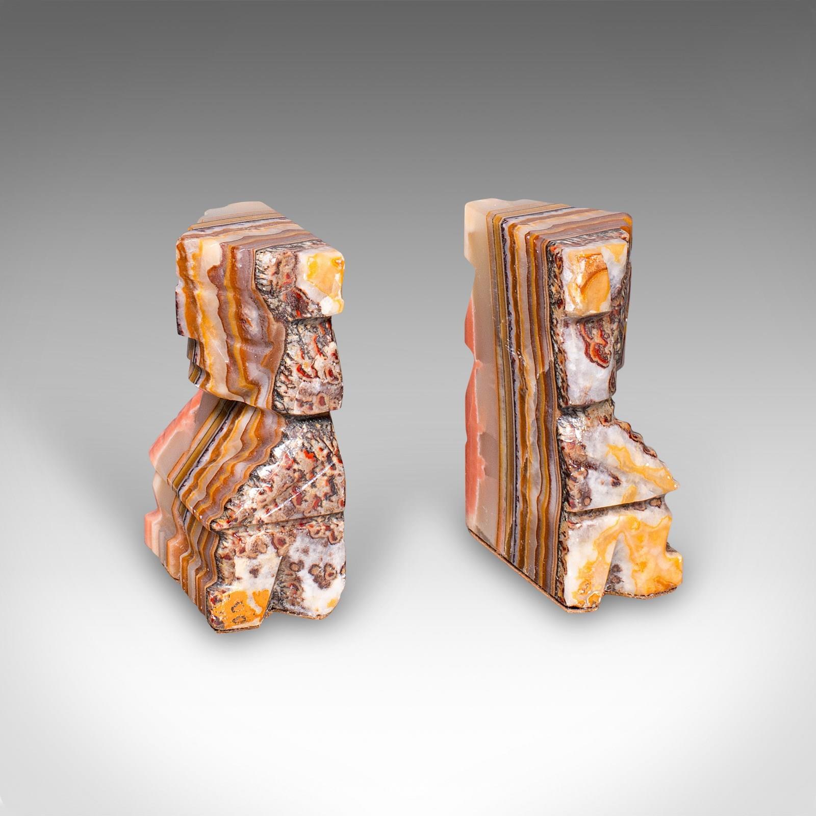 This is a pair of vintage Aztec bookends. A South American, hand-carved banded agate stone figure, dating to the Art Deco period, circa 1930. Distinctive figural carving and superb natural colour make these book rests a striking decorative addition.
