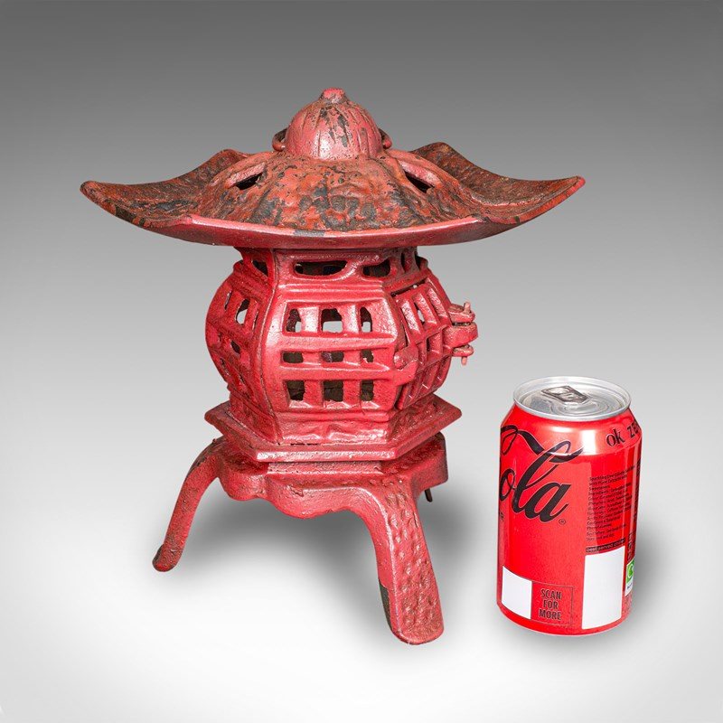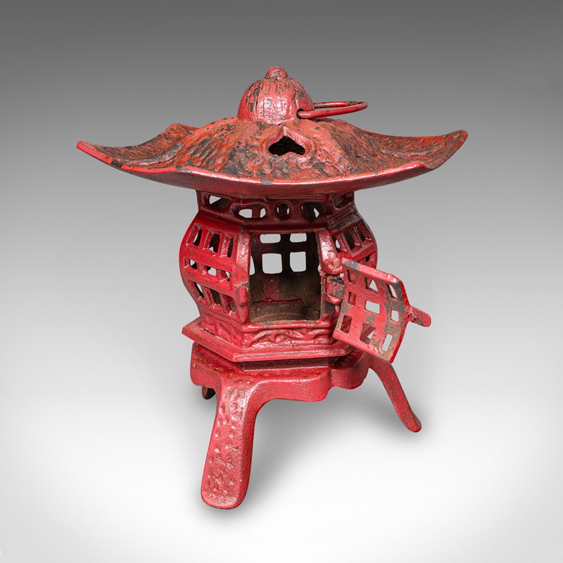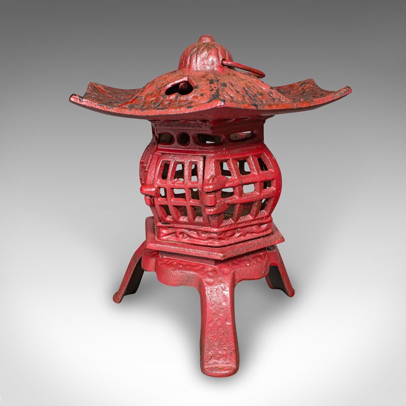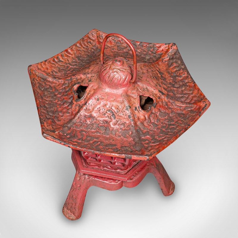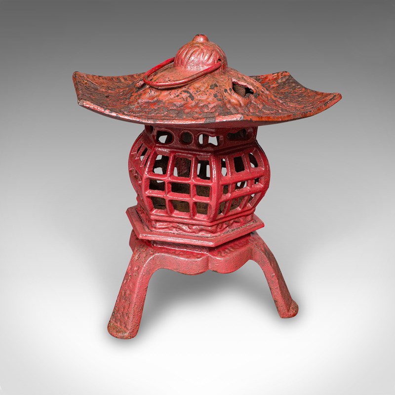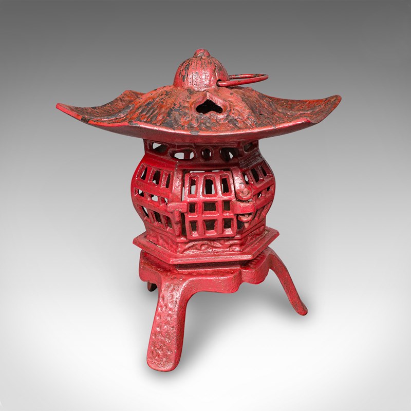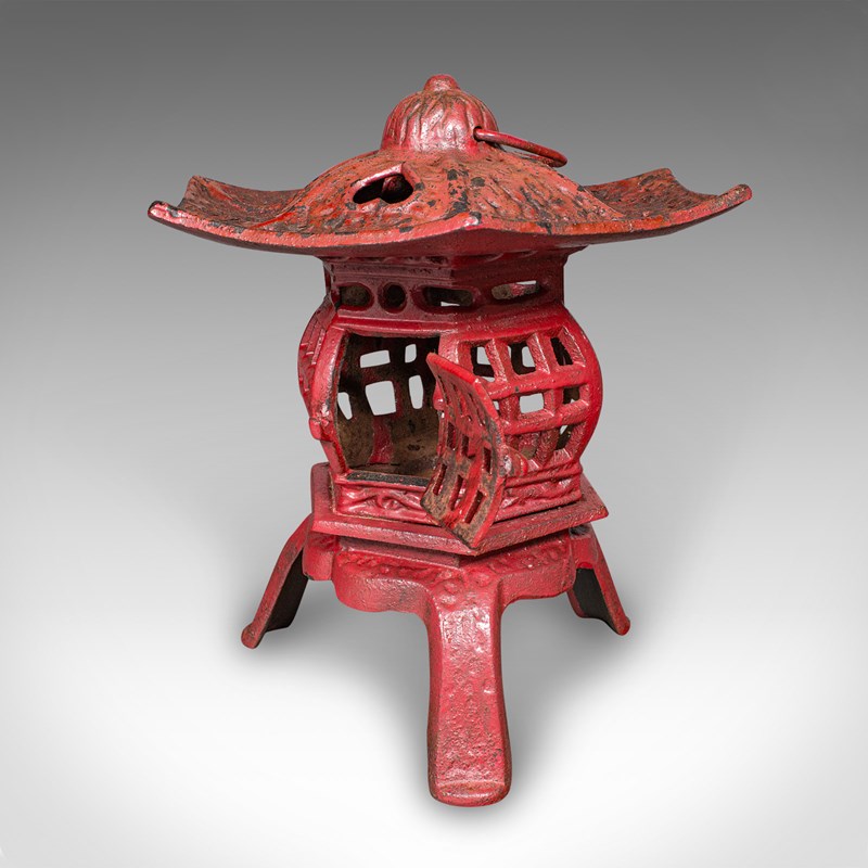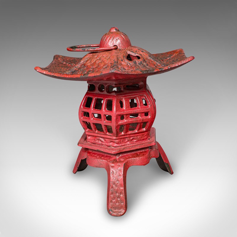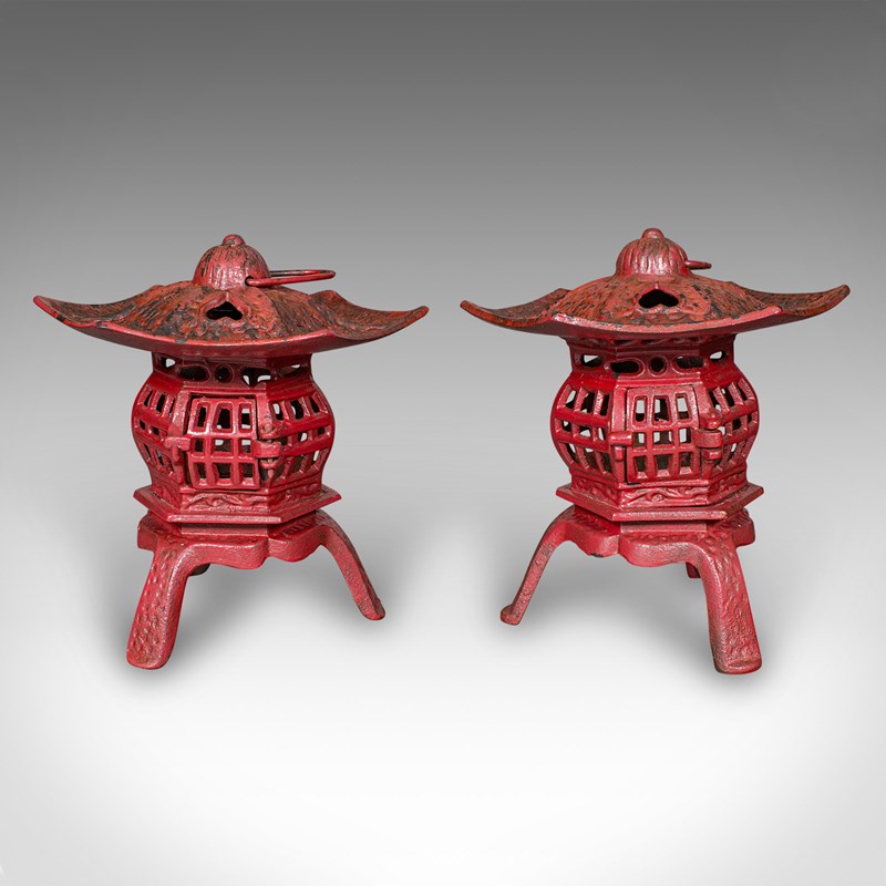 This is a pair of vintage Pagoda lanterns. A Japanese, painted cast iron tea light holder, dating to the Art Deco period, circa 1930. Wonderfully decorative and versatile, these lanterns can be used free-standing or suspended, bringing an elegant Japanese accent to porches, verandas, or interiors.