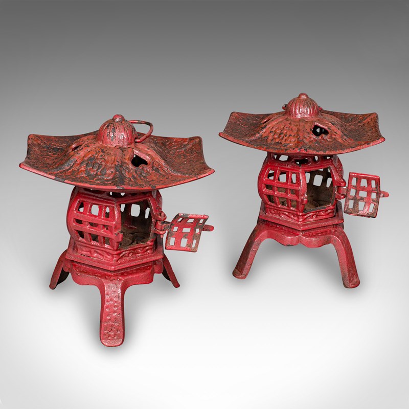 Pair Of Vintage Pagoda Lanterns, Japanese, Cast Iron Tea Light Holders, Art Deco