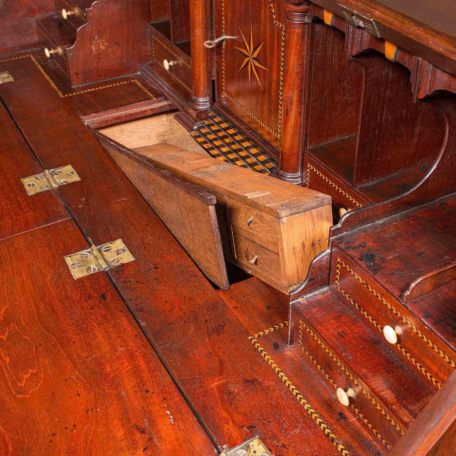 Offering a near unprecedented collection of hidden storage, this exceptional antique barrister's bureau bears the craftsmanship and pursuit of concealment to fascinate any observer, in addition to an elegance to be expected of the best furniture from the period. A rare opportunity to acquire a bureau that presents function in every imaginable way, set within cabinetry of the first order. Solid joints and construction, delivered ready for the home or institution.