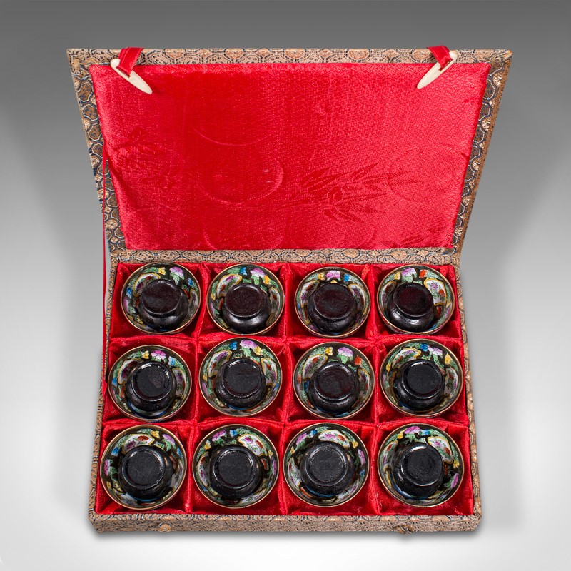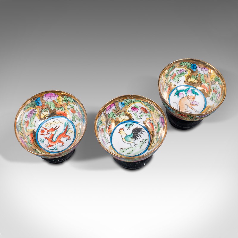 This is a set of vintage zodiac cups. A Chinese, ceramic miniature dish displaying the lunar calendar of animal signs, dating to the mid 20th century, circa 1950.