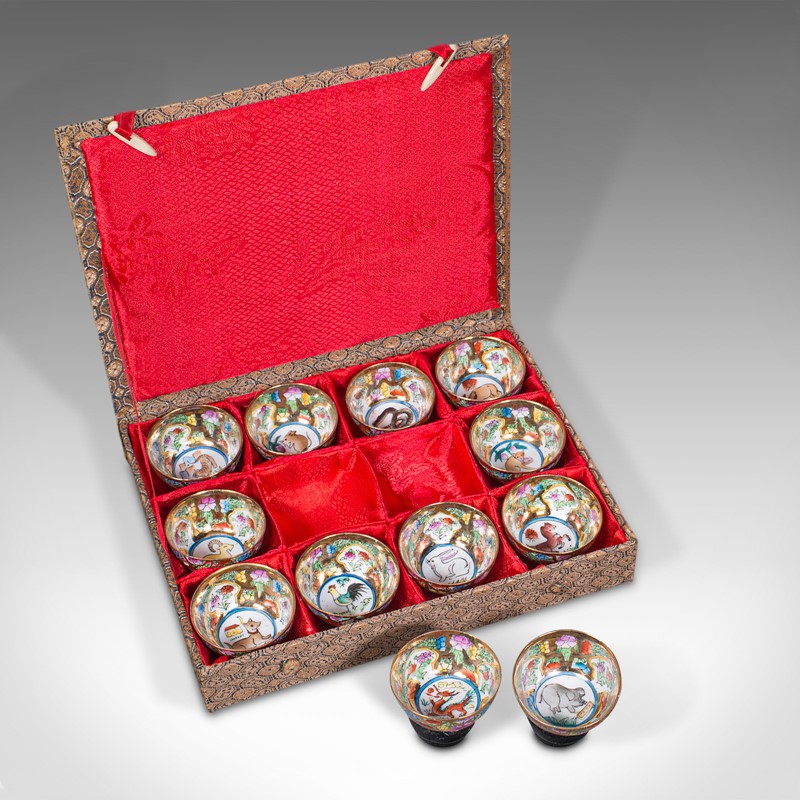 Set of 12 Vintage Zodiac Cups, Chinese, Ceramic Miniature Dish, Kung Fu Teacup