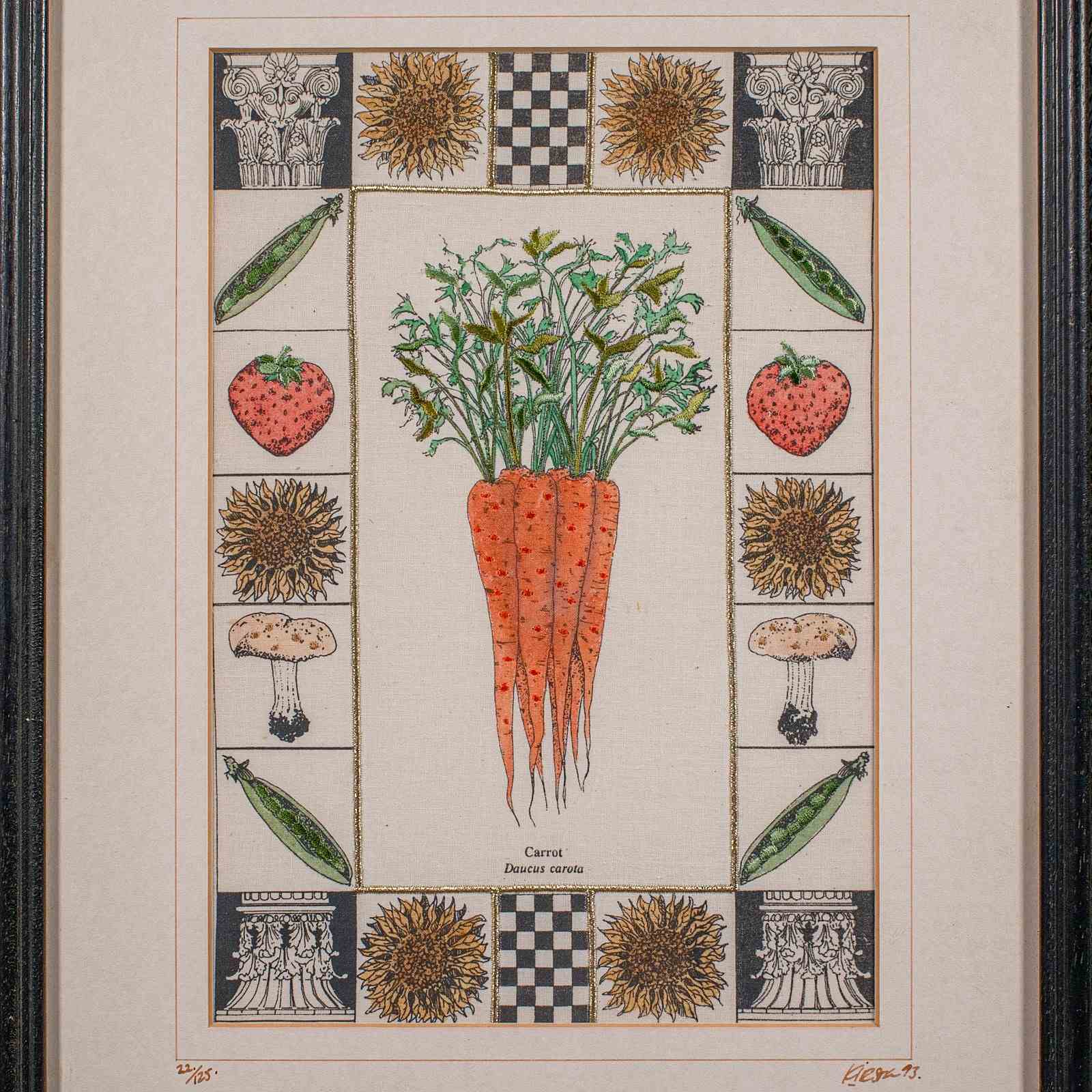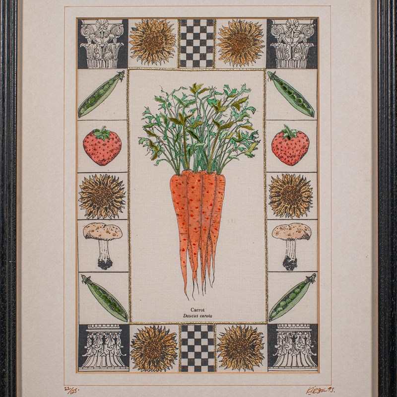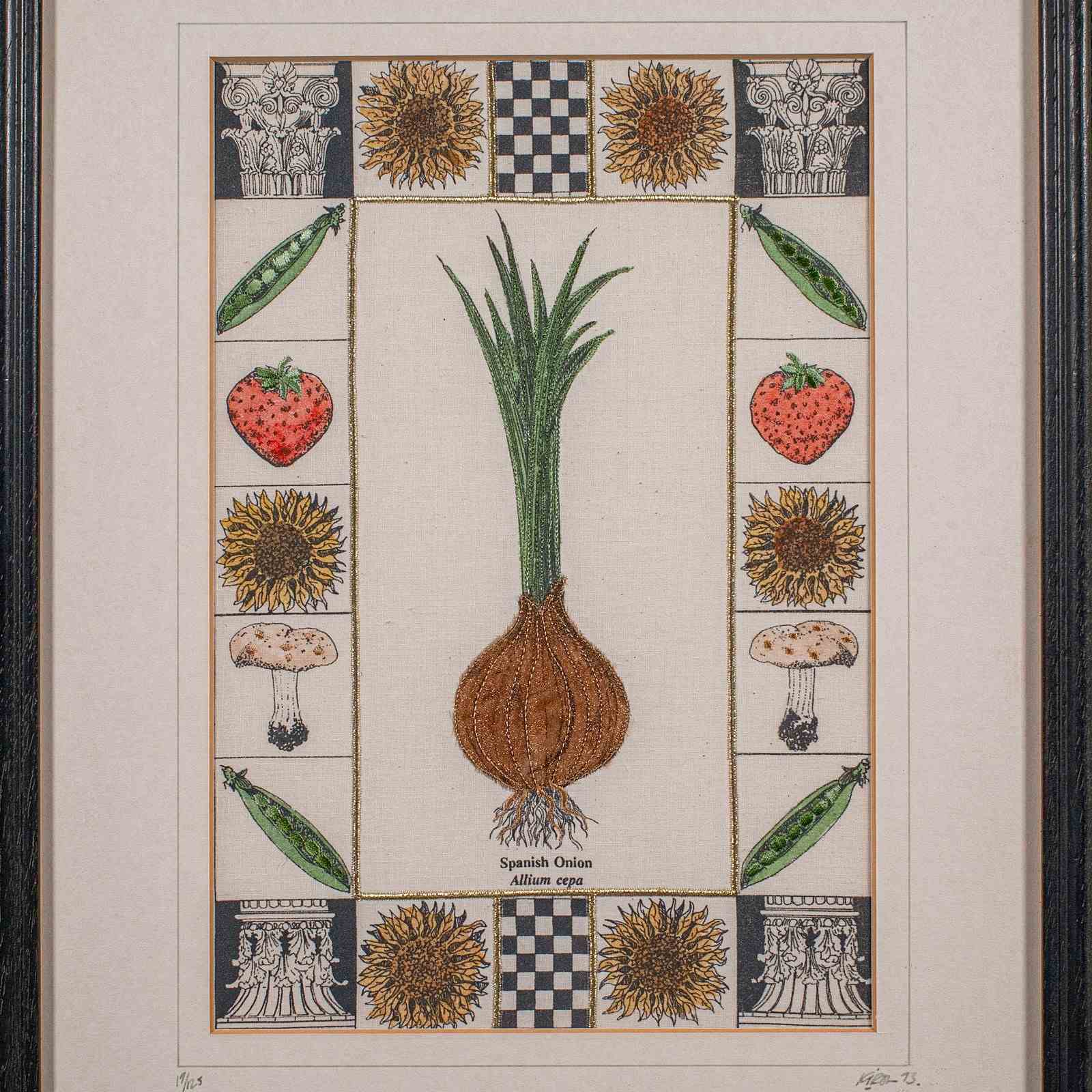 Distinctive embroidered scenes displaying Red poppies, Spanish onions, carrots and grapes