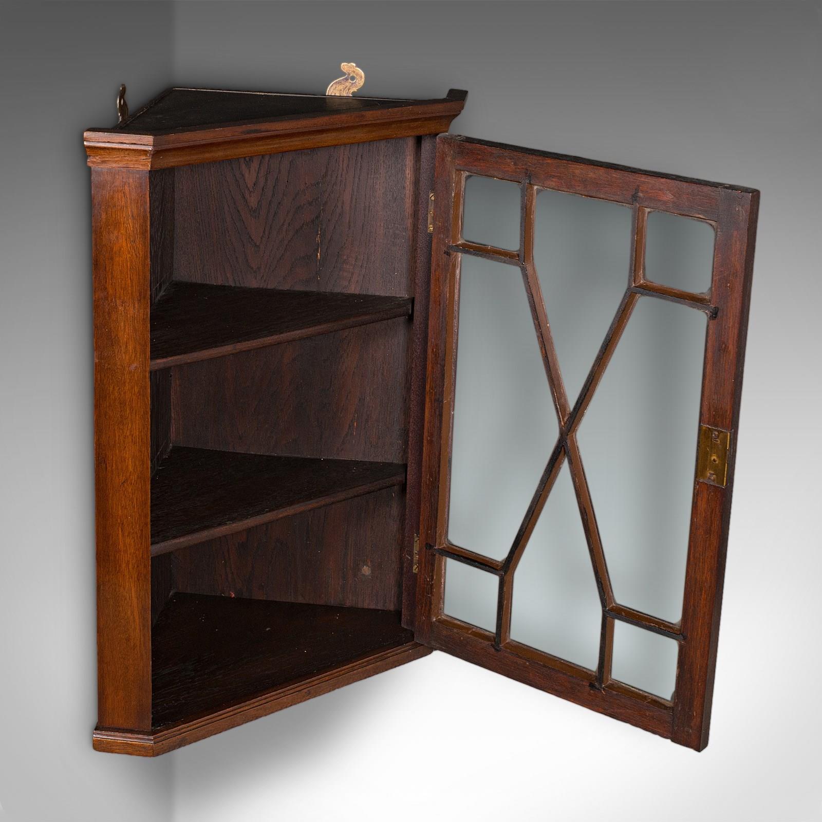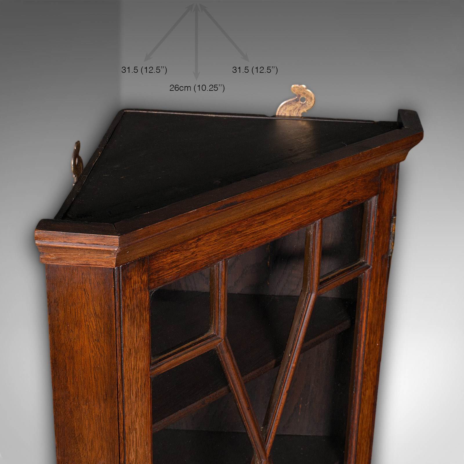 This is a small antique corner cabinet. An English, glazed display cupboard, dating to the Edwardian period, circa 1910.