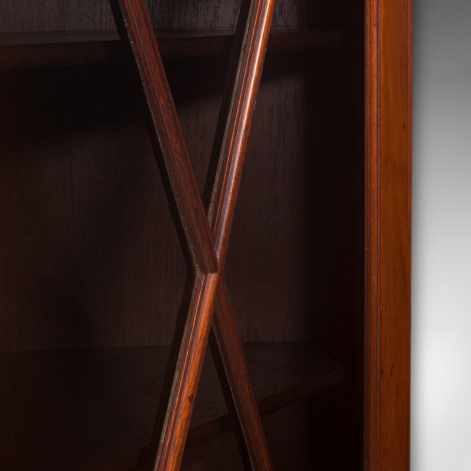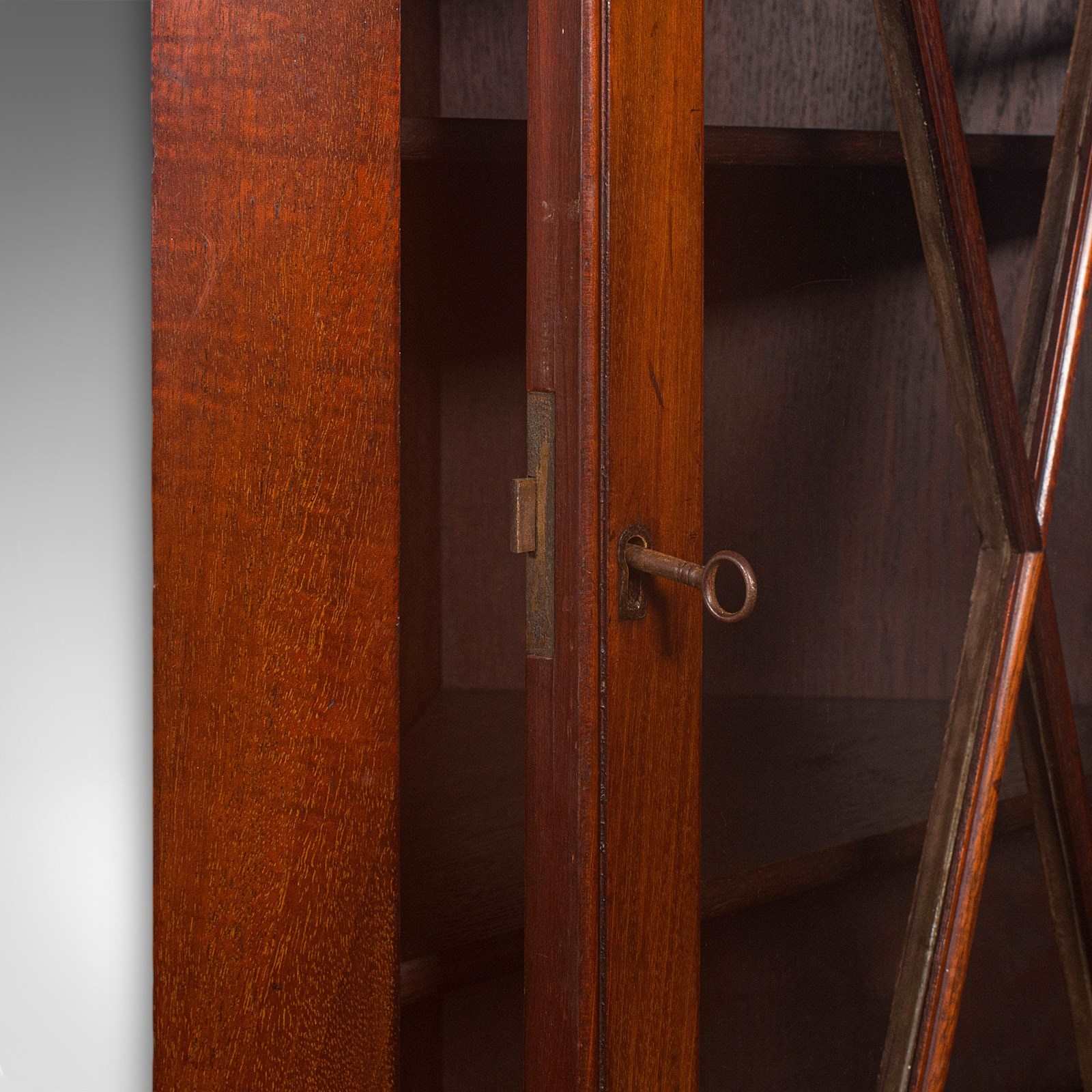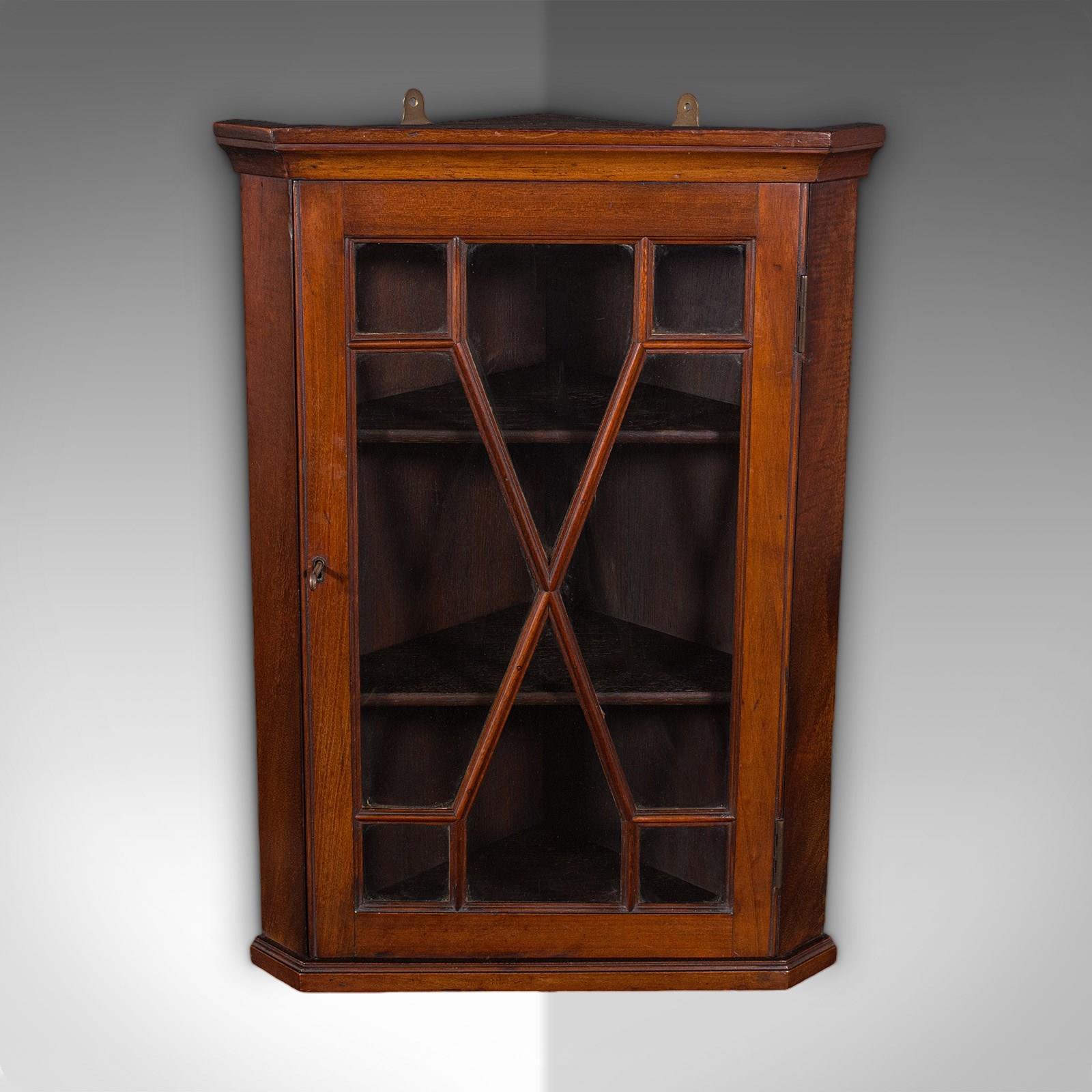 This is a small antique glazed corner cupboard. An English, mahogany wall display cabinet, dating to the Edwardian period, circa 1910.