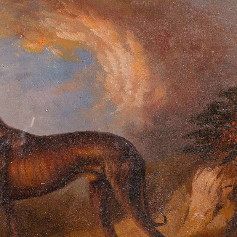 This is a delightful antique greyhound painting, presenting an appealing study of the breed. Delivered ready to display.