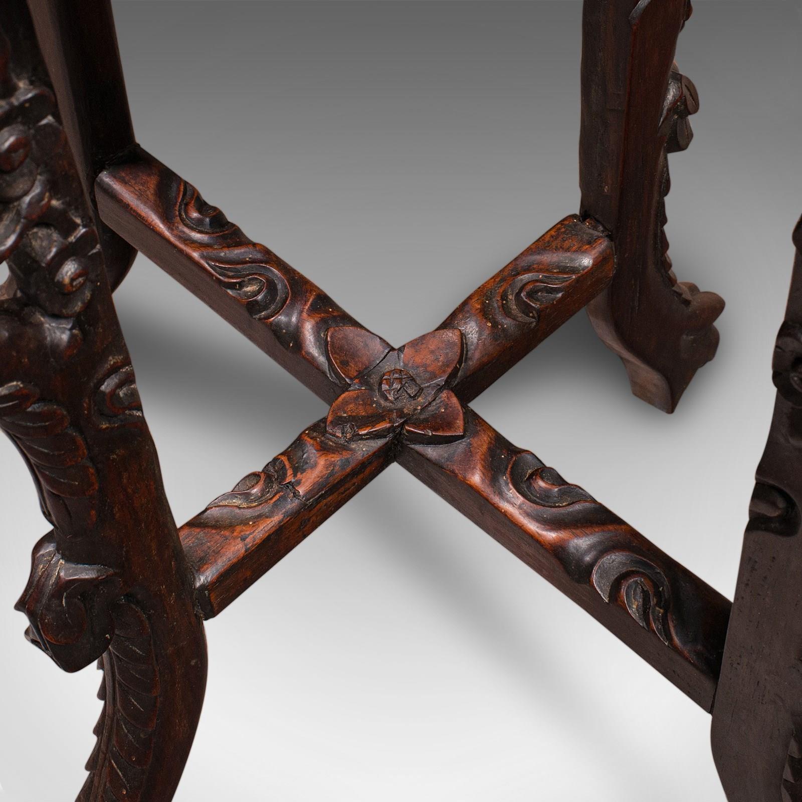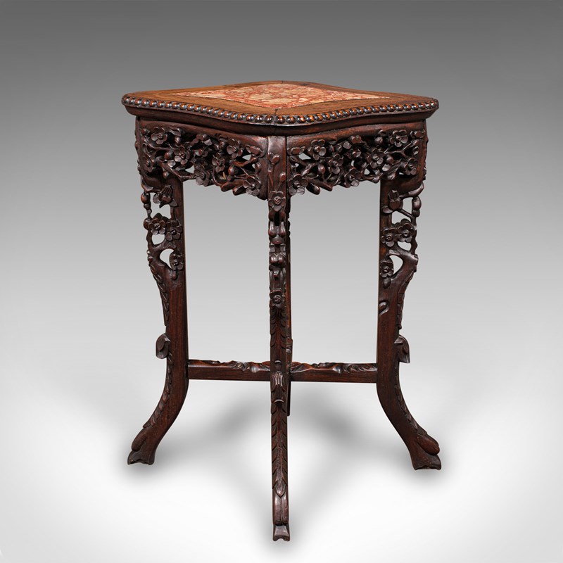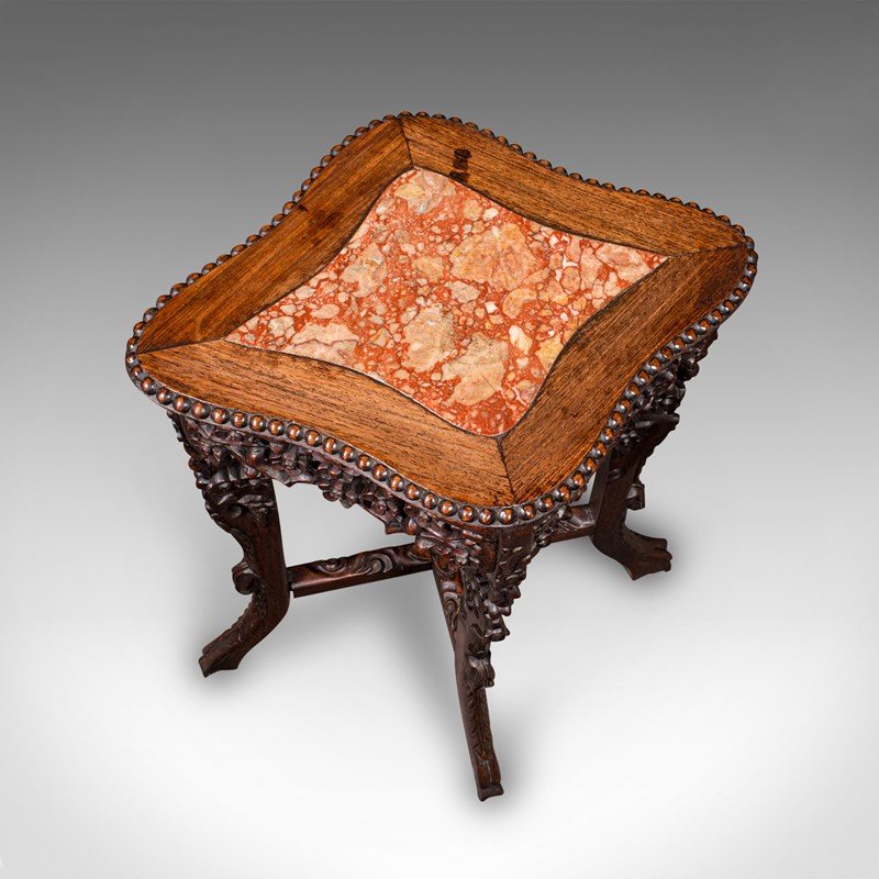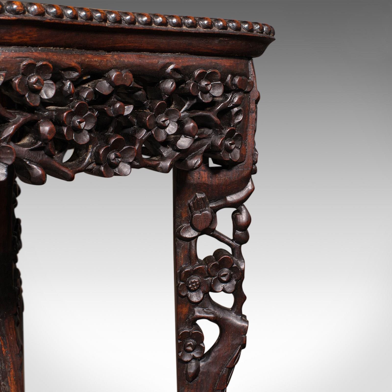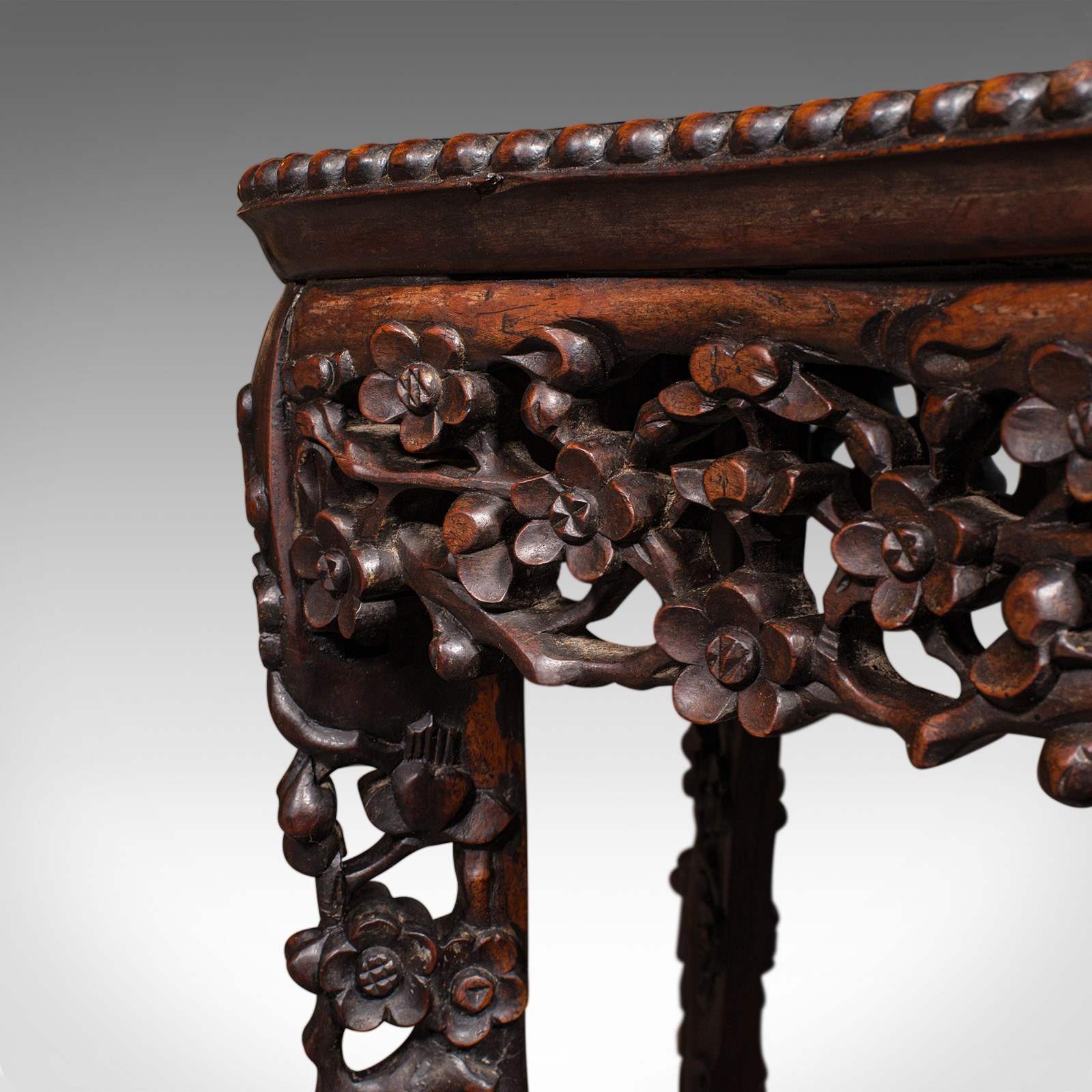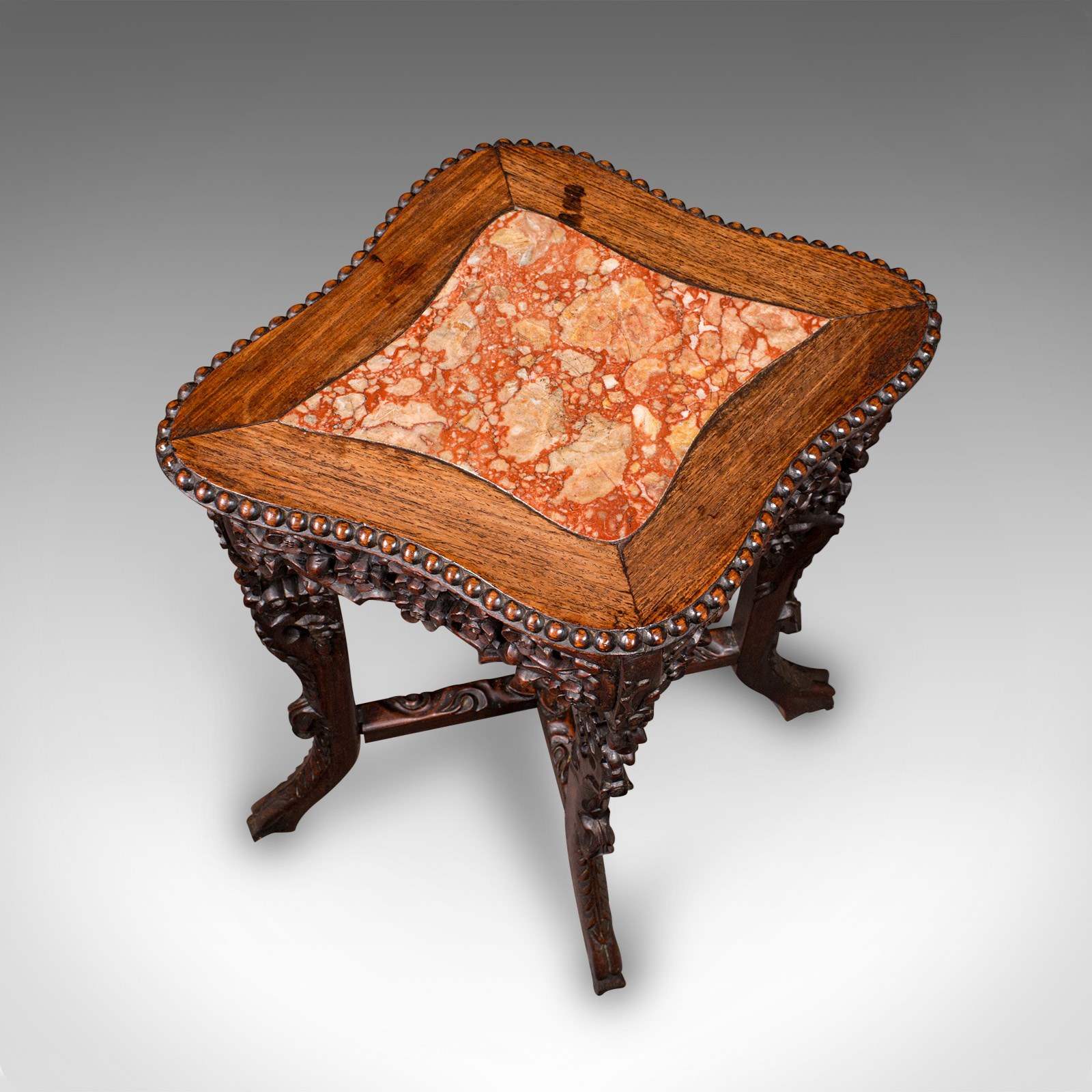 This is a small antique jardiniere stand. An Oriental, mahogany and marble wine or lamp table, dating to the Victorian period, circa 1870. A delightfully petite Chinoiserie piece with superb carving and wonderful colour.