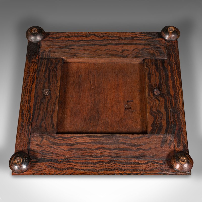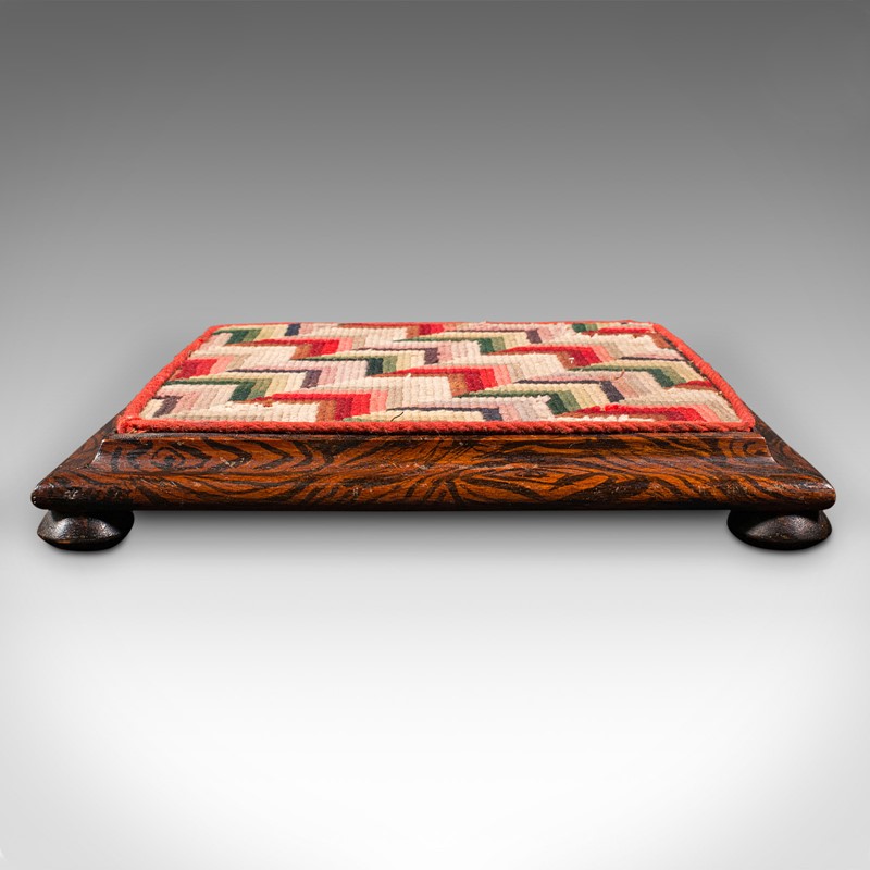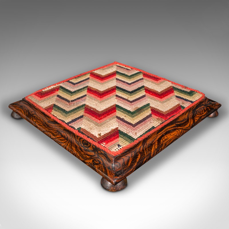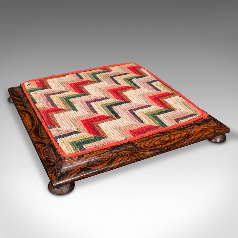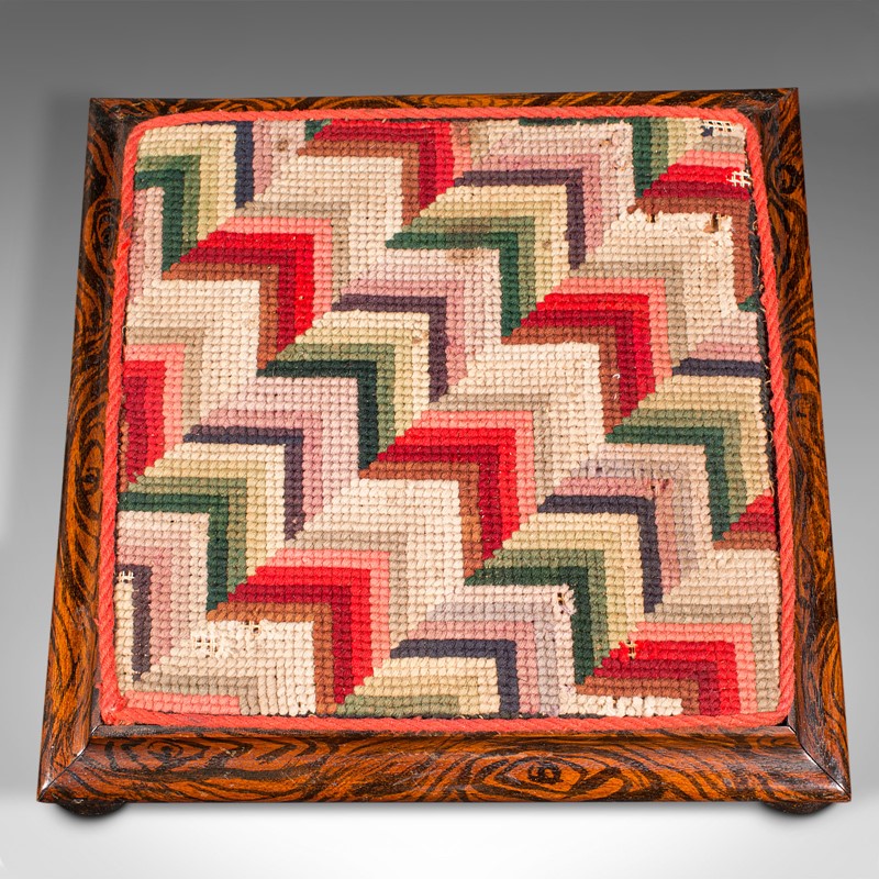 This is a small antique tabletop sampler. An English, faux rosewood and embroidered miniature stool, dating to the early Victorian period, circa 1850.