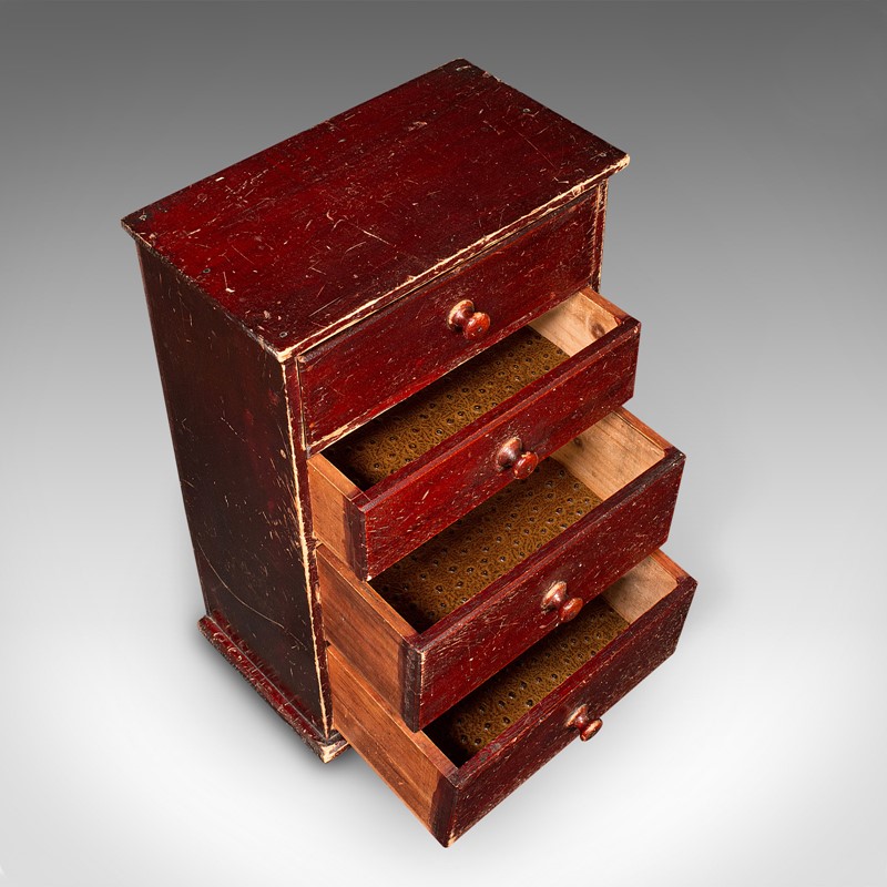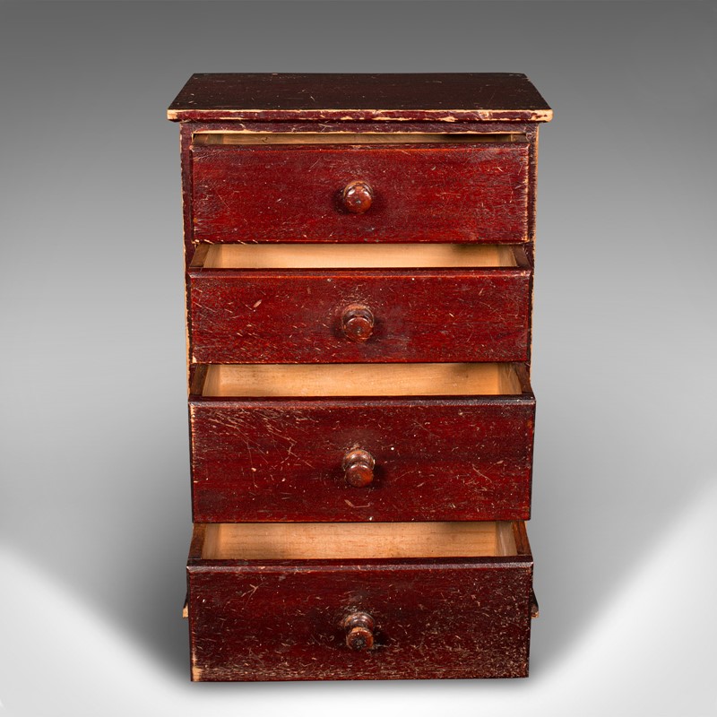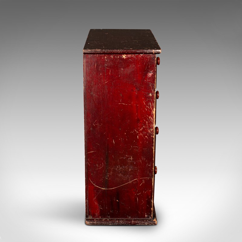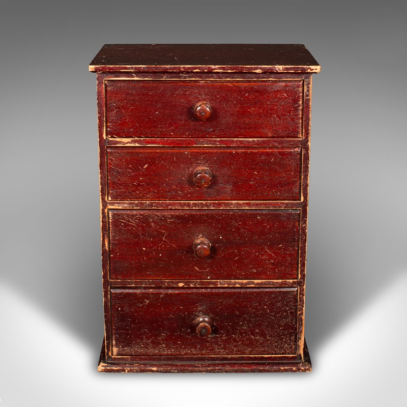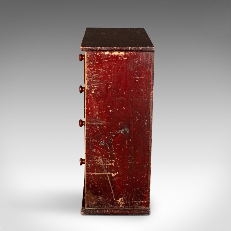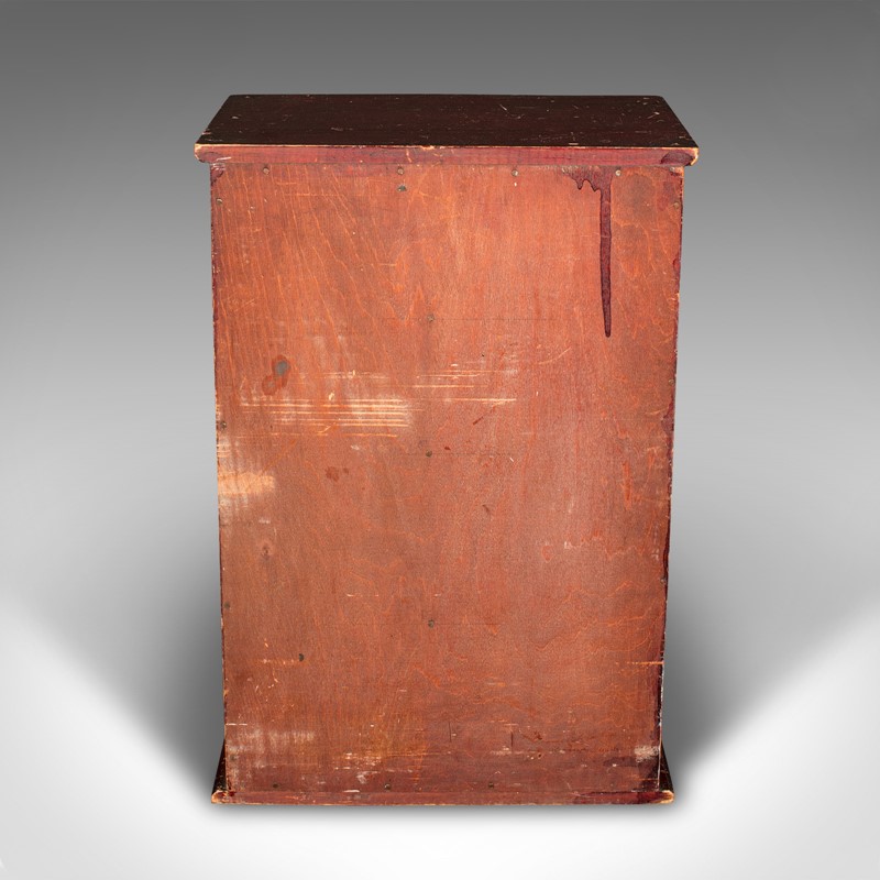 This is a small set of antique apothecary drawers. An English, stained pine countertop chest, dating to the Edwardian period, circa 1910.
