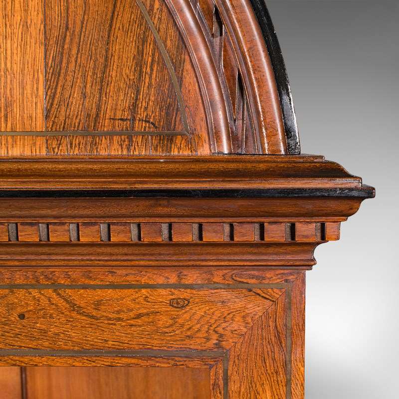 Domed crown hosts an inlaid brass foliate wreath, whilst dentil moulding accentuates the edge