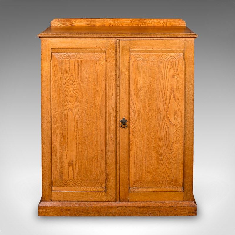 This is an antique side cabinet. An English, ash two-door book cupboard, dating to the late Victorian period, circa 1880.