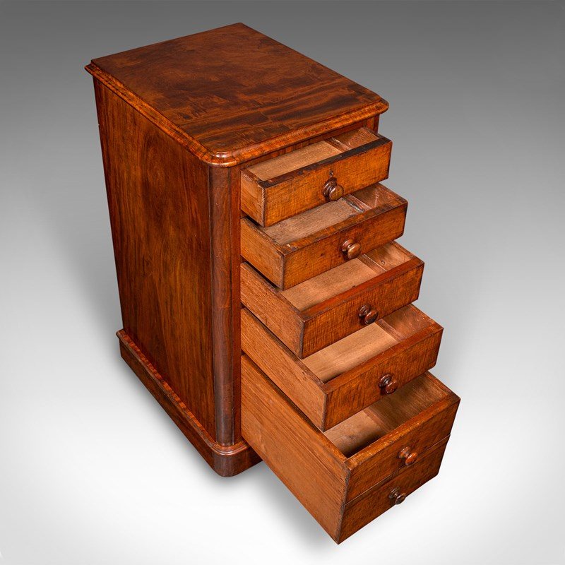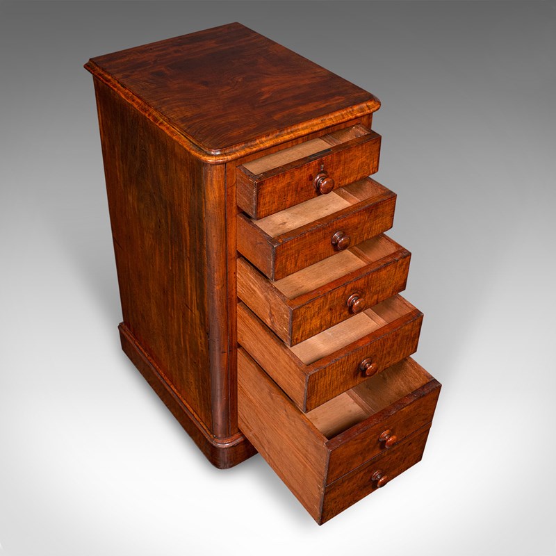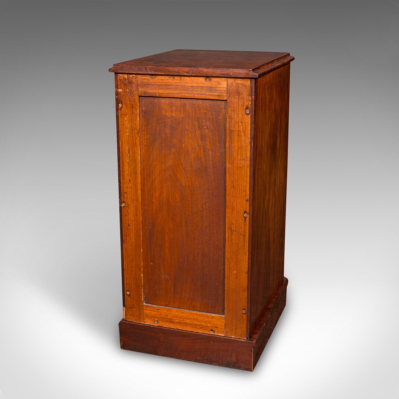This is a pair of antique nightstands. An English, mahogany bank of drawers or bedside pedestals, dating to the mid Victorian period, circa 1860.