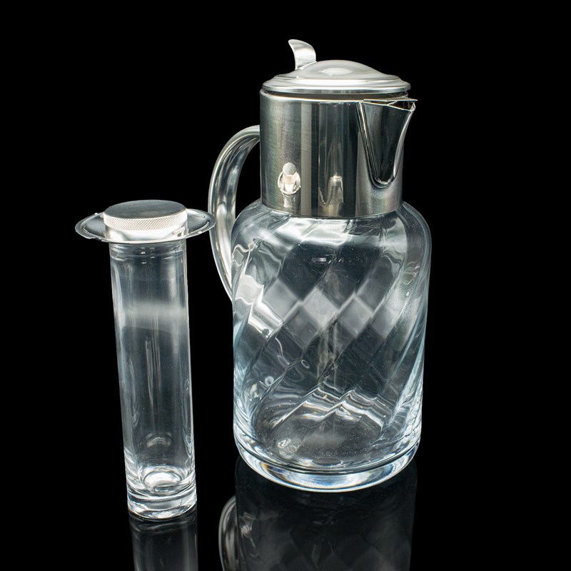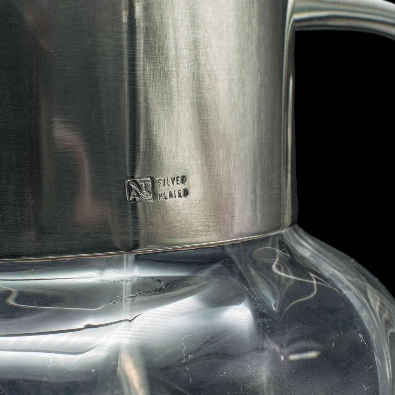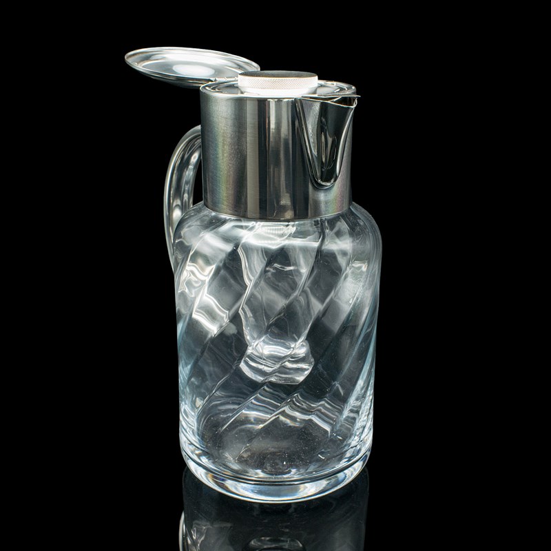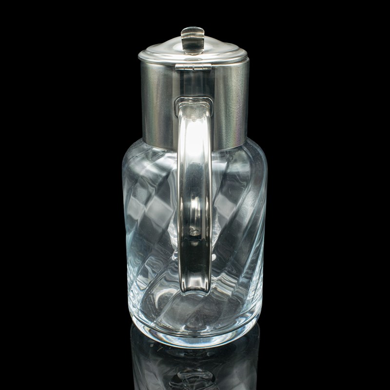 This is a vintage lemonade pitcher. An English, glass and silver plated cordial cooler jug, dating to the mid 20th century, circa 1950.