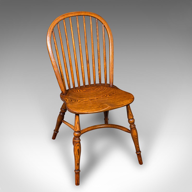 This is a charming trio of vintage country kitchen chairs. An English, ash & elm stick back seat and presented in Victorian revival taste, dating to the late 20th century, circa 1980. Handsome and well-crafted, these chairs exude classic farmhouse character and offer enduring comfort for the traditional dining room or country breakfast setting.