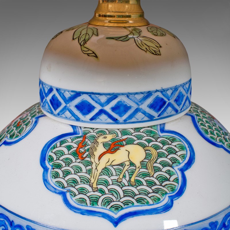 This is a vintage Art Deco table lamp. A Chinese, ceramic accent light, dating to the mid 20th century, circa 1950.
