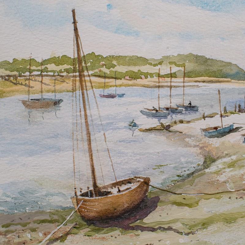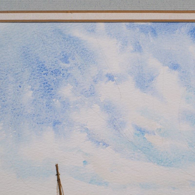 This is a vintage beach landscape painting. An English, watercolour with nautical interest, dating to the late 20th century, circa 1991.