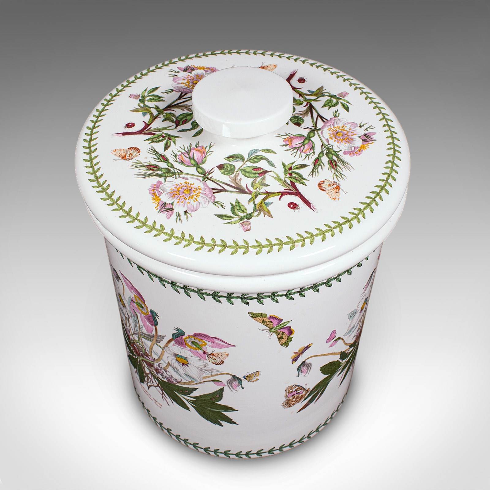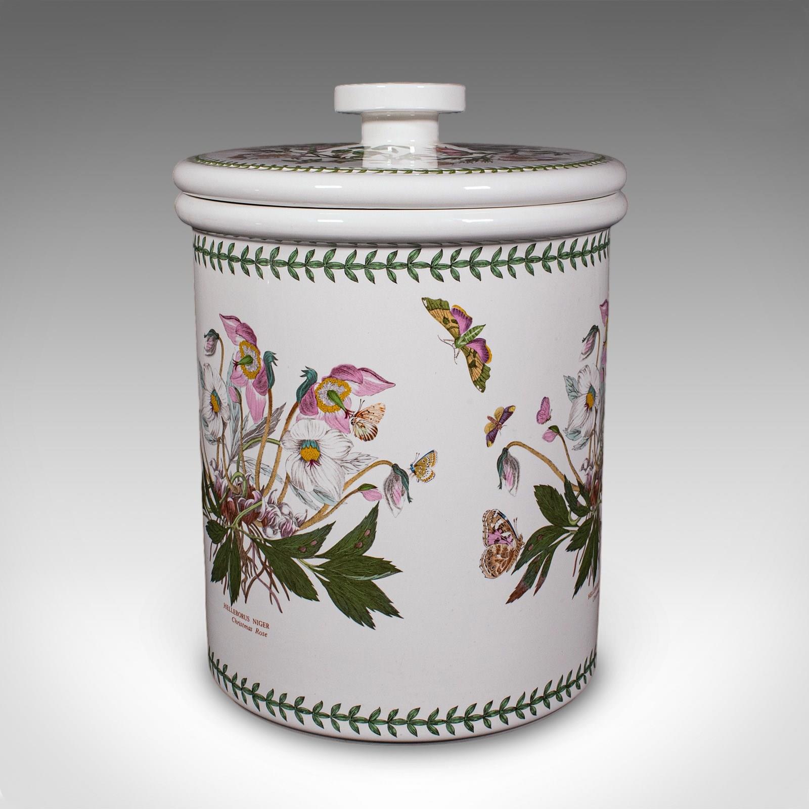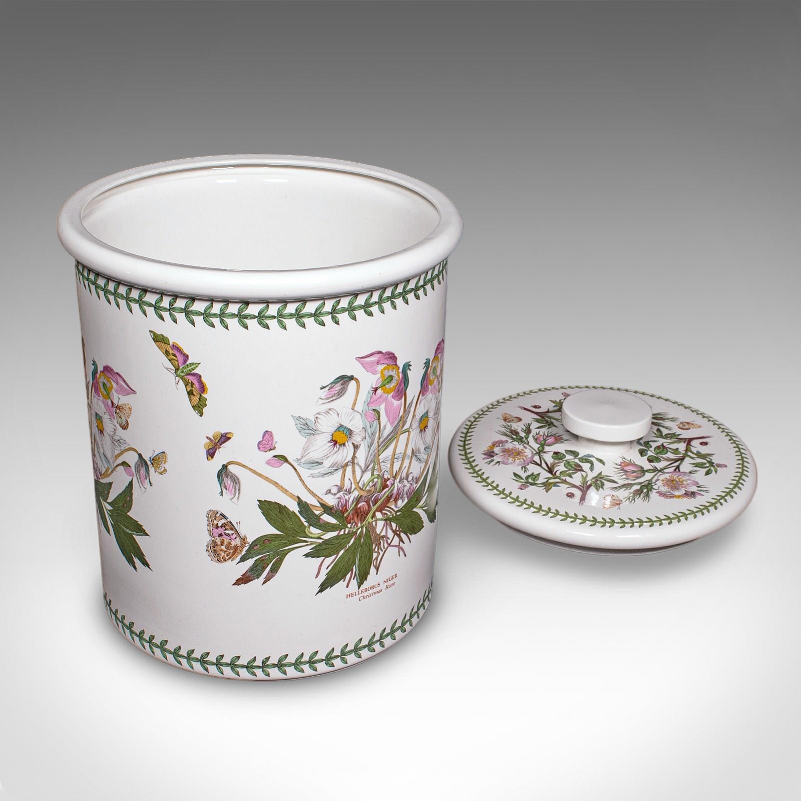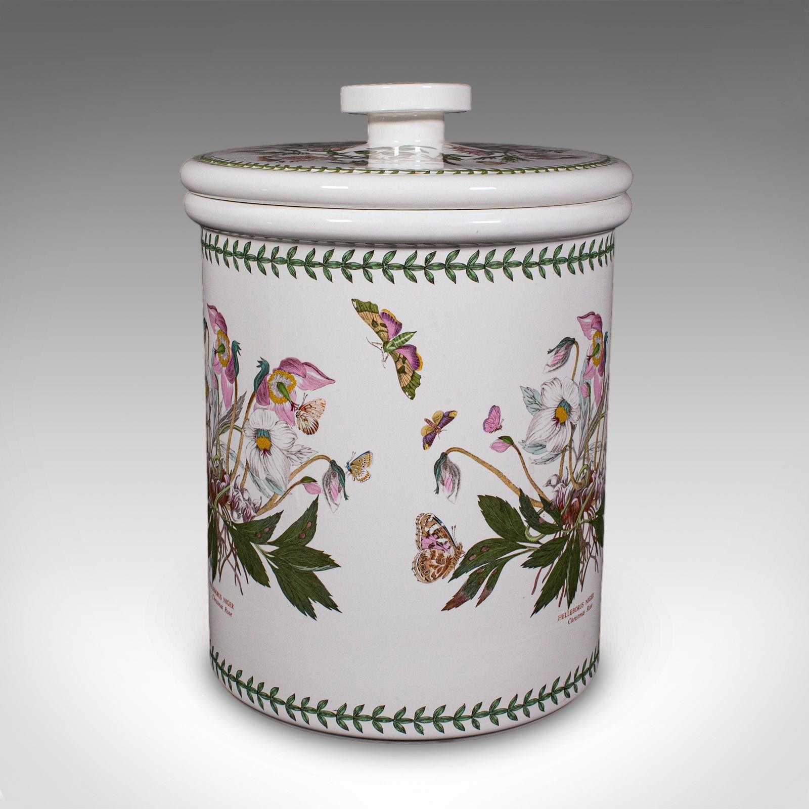 This is a vintage bread crock. An English, ceramic kitchen counter storage jar, dating to the late 20th century, circa 1980. A charming and generously proportioned example, with delightful botanical decoration and practical appeal.