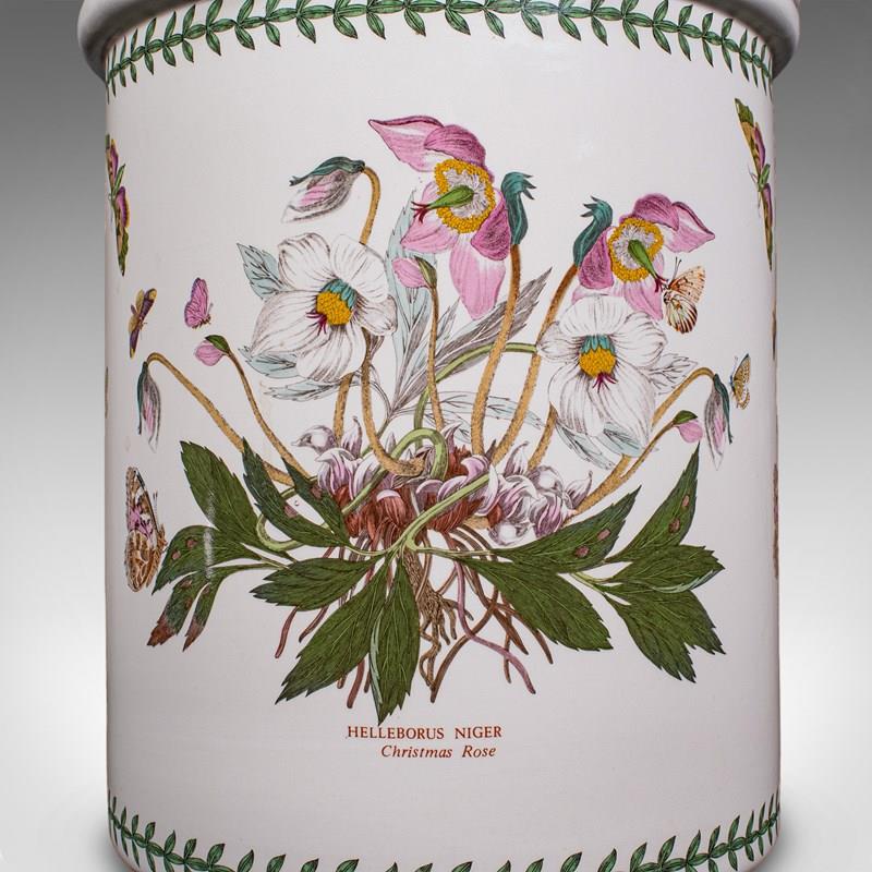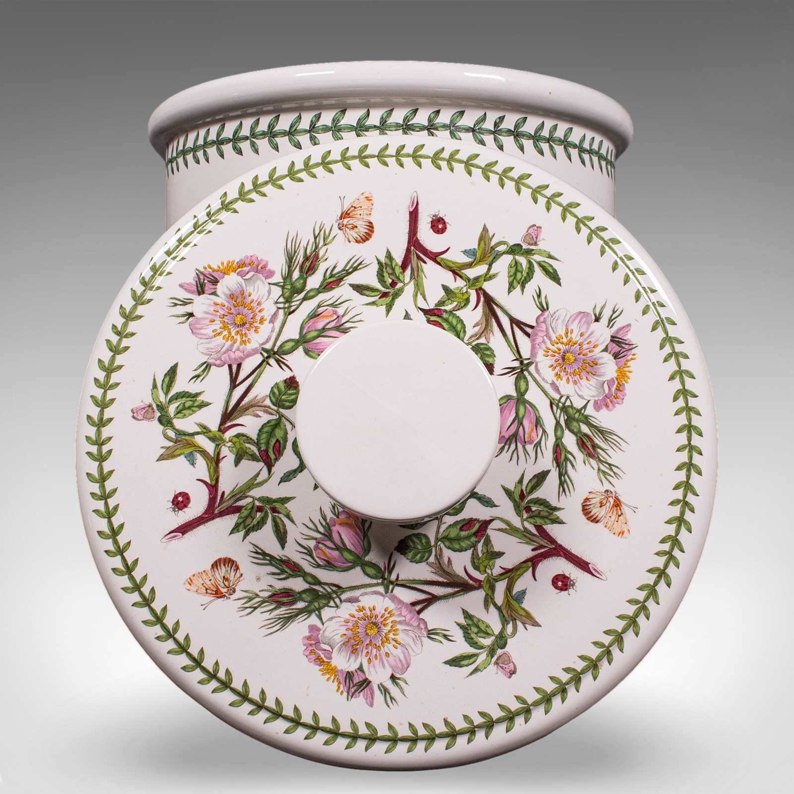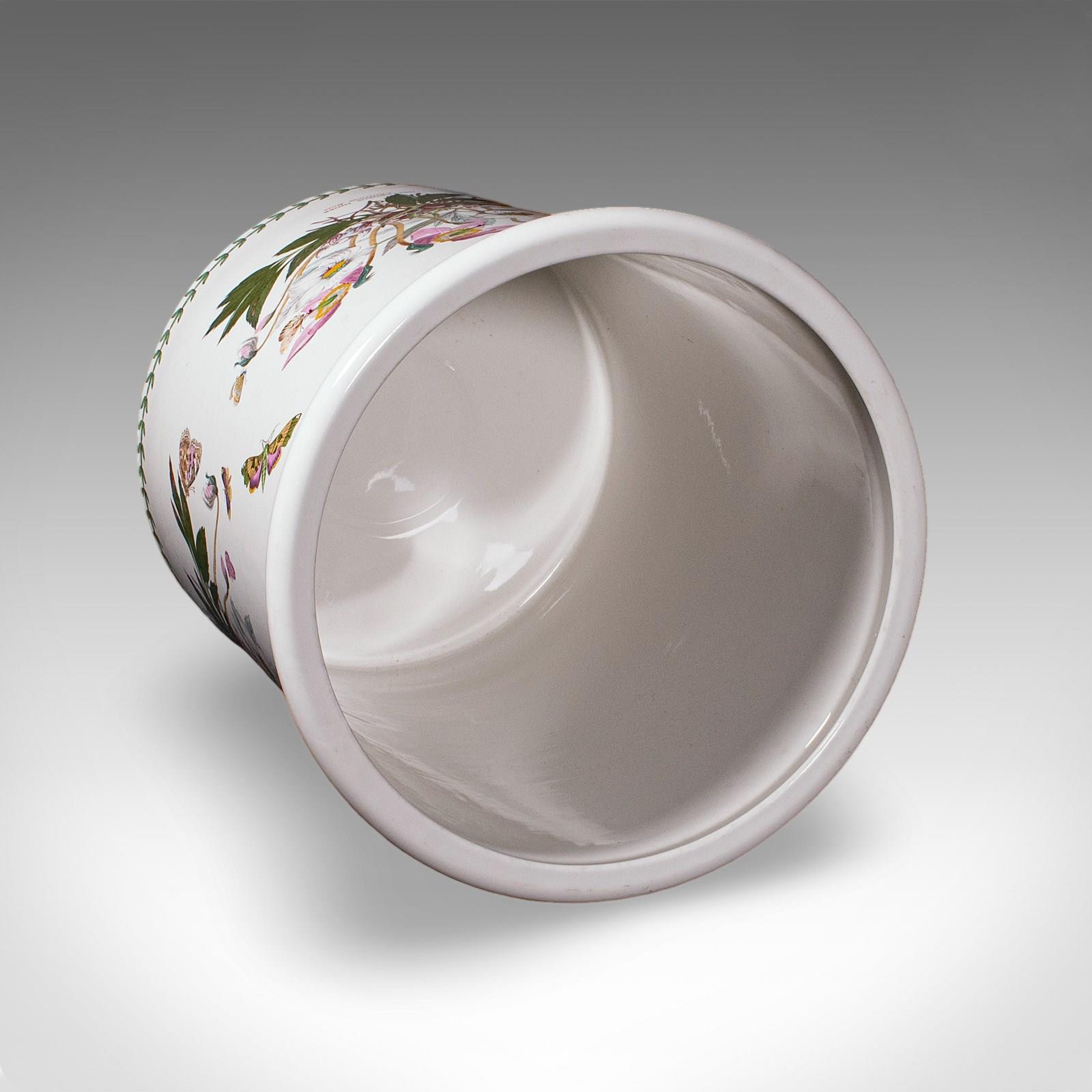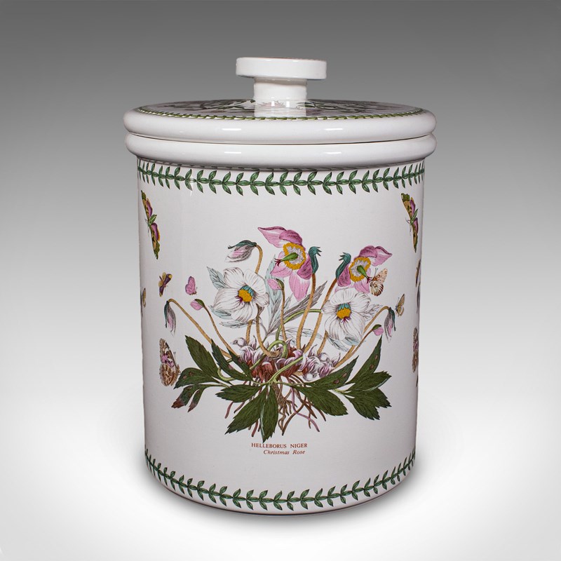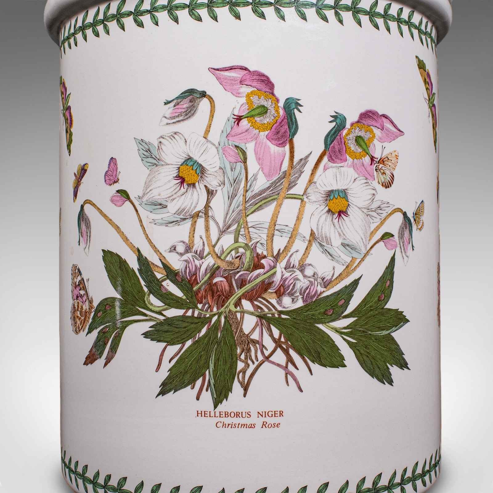 This is a vintage bread crock. An English, ceramic kitchen counter storage jar, dating to the late 20th century, circa 1980. A charming and generously proportioned example, with delightful botanical decoration and practical appeal.