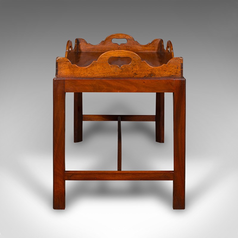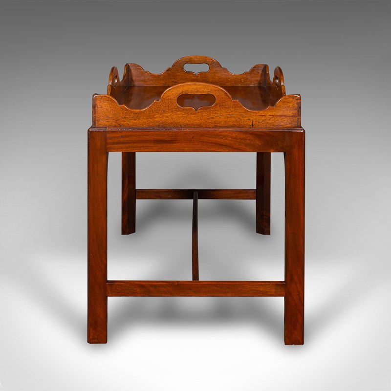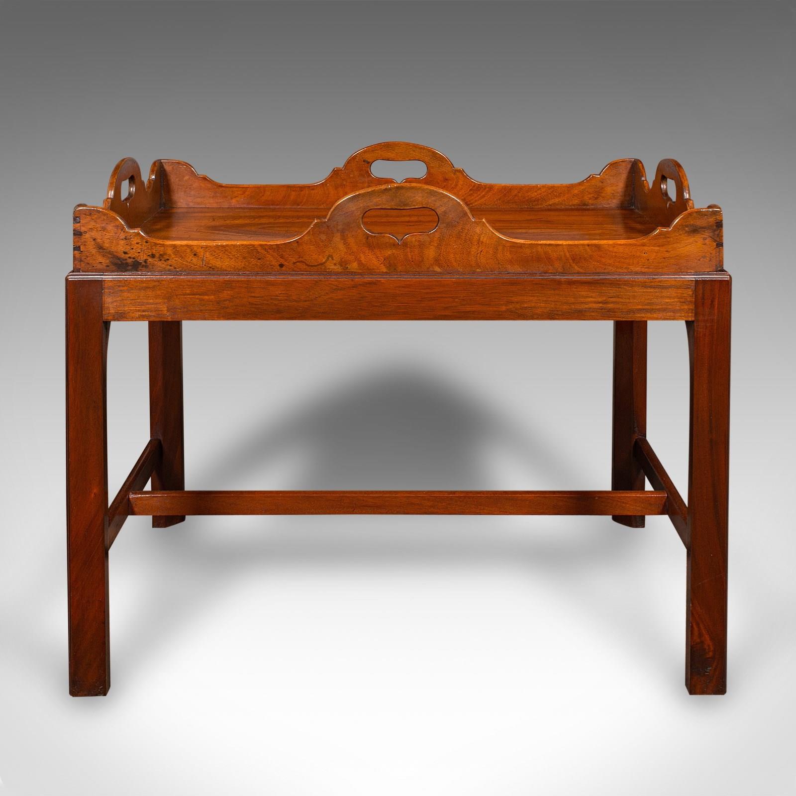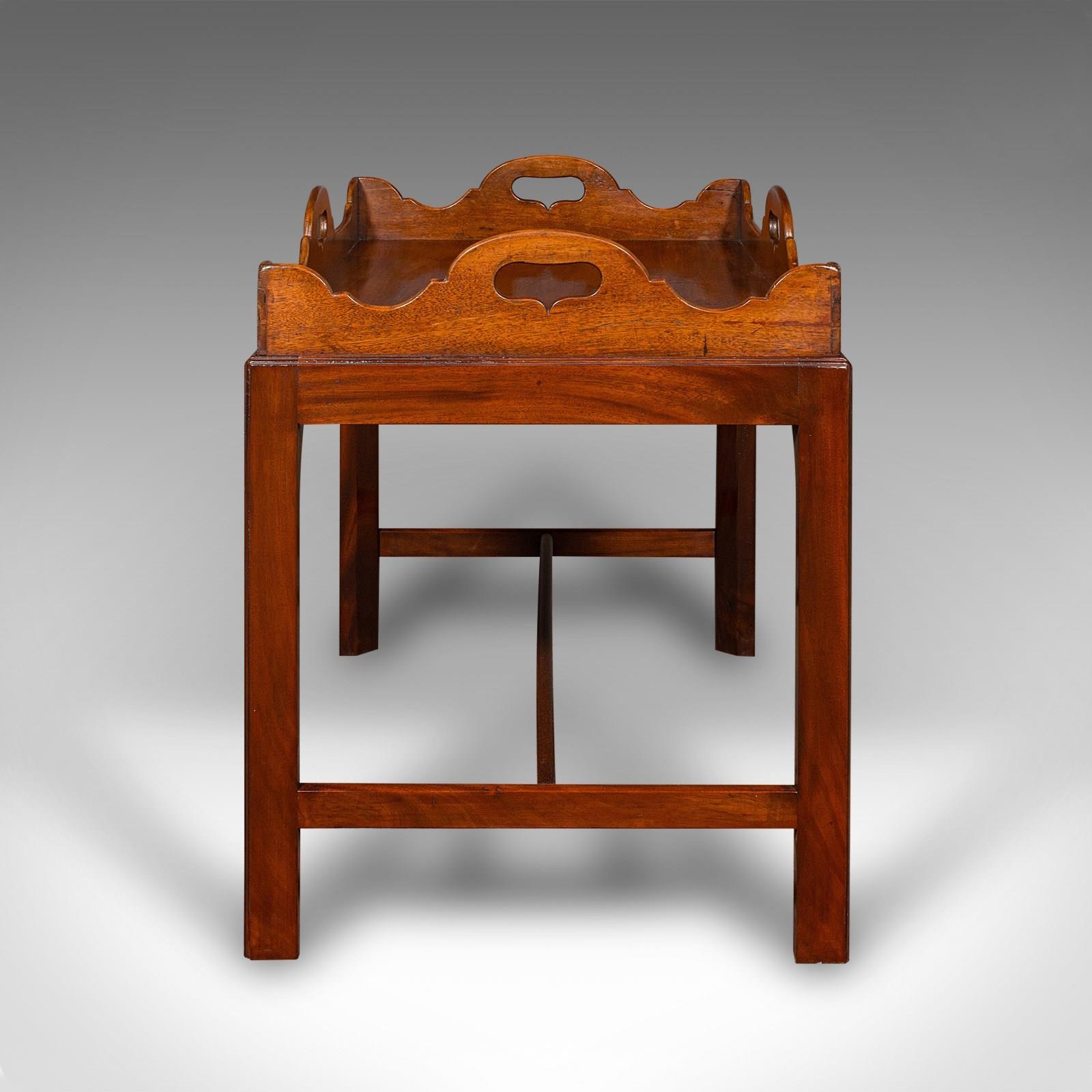 This is a vintage butler's serving table. An English, mahogany afternoon tea tray on stand in Georgian revival taste, dating to the Art Deco period, circa 1930.