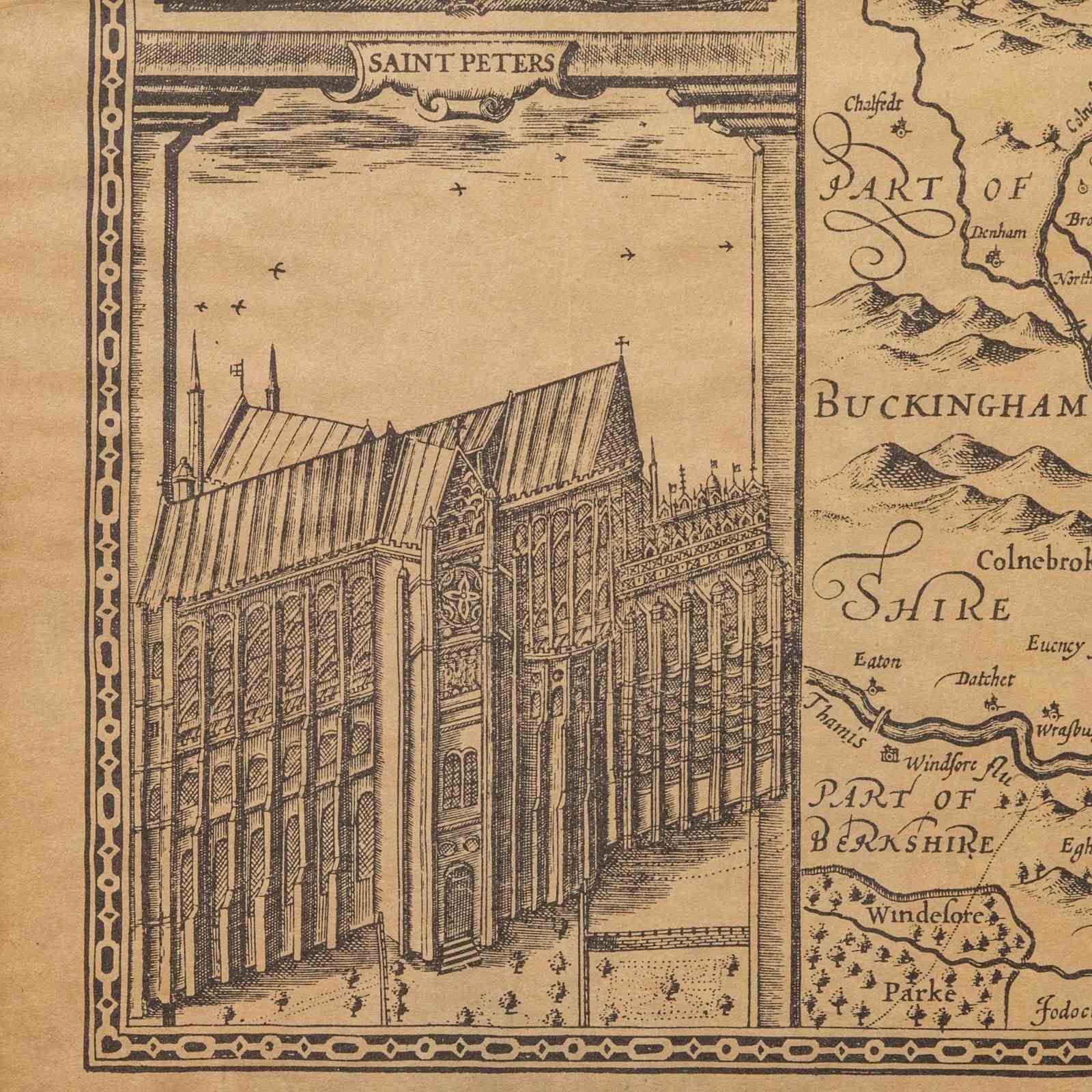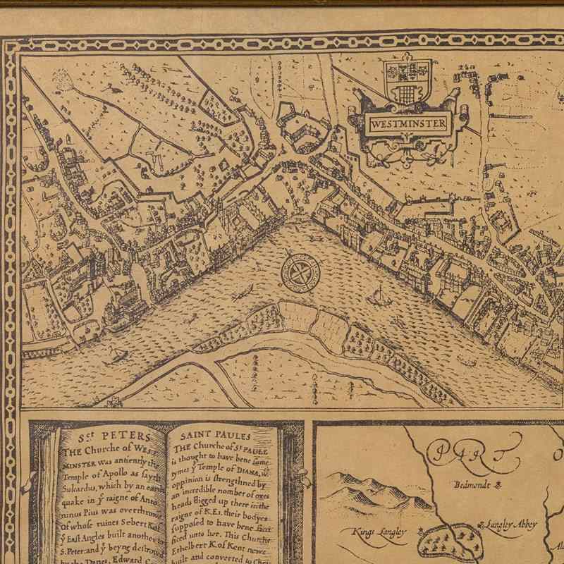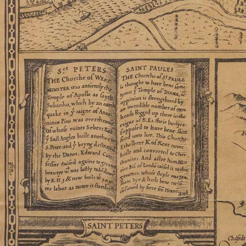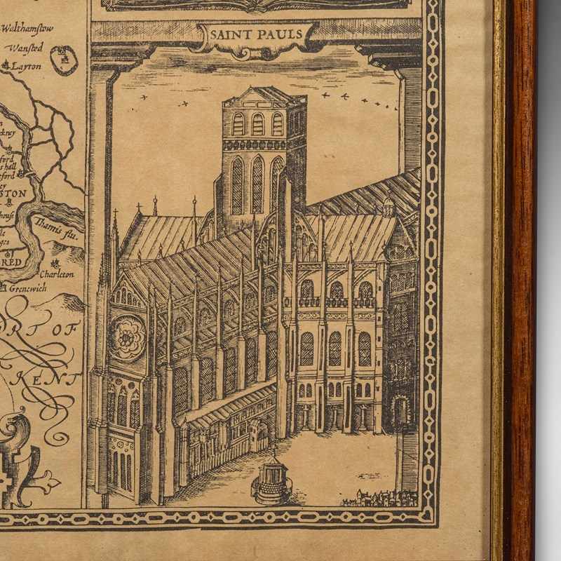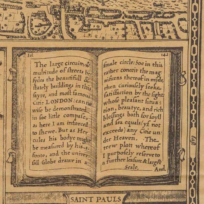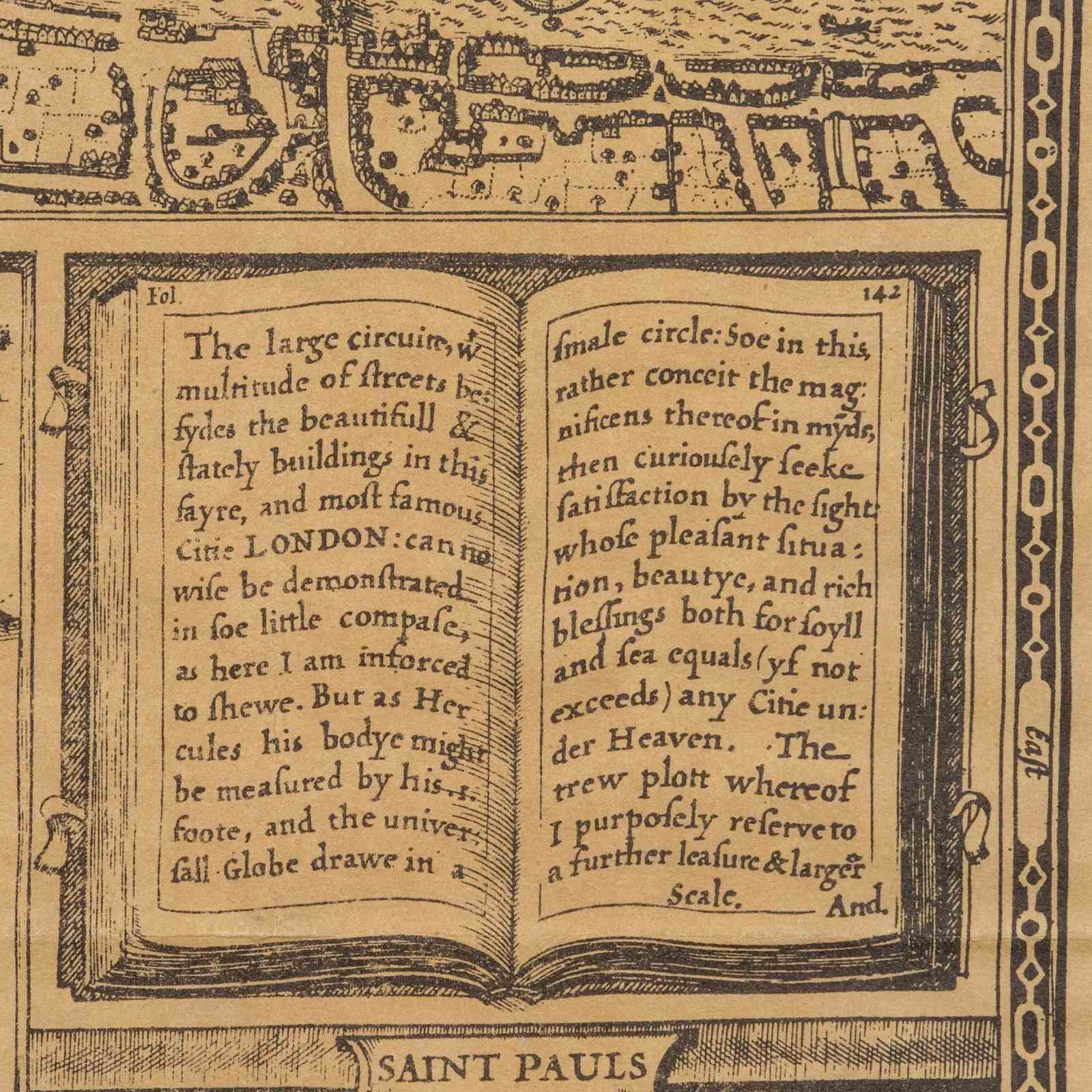 Features a detailed excerpt of the City of London, as it appeared in the late 16th century