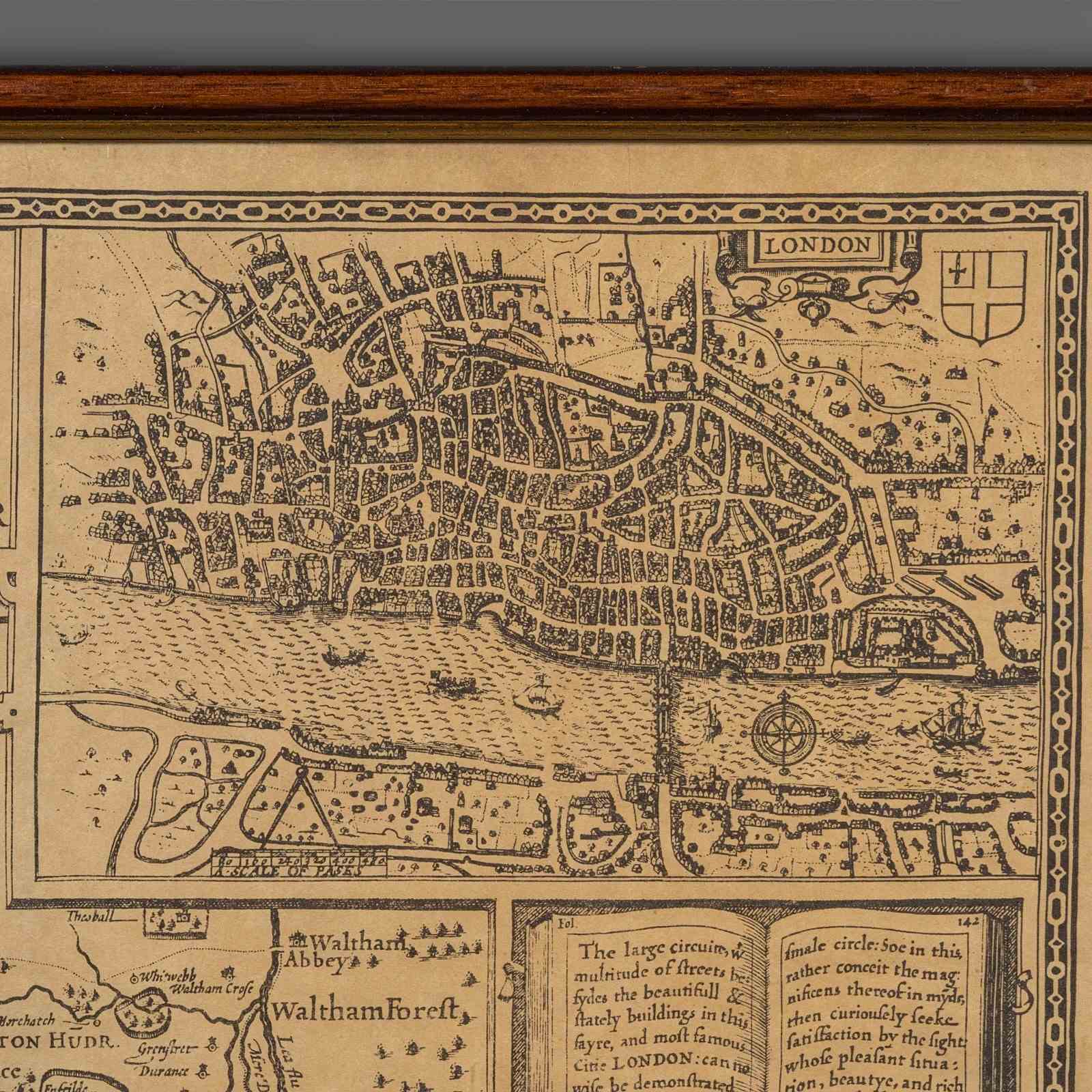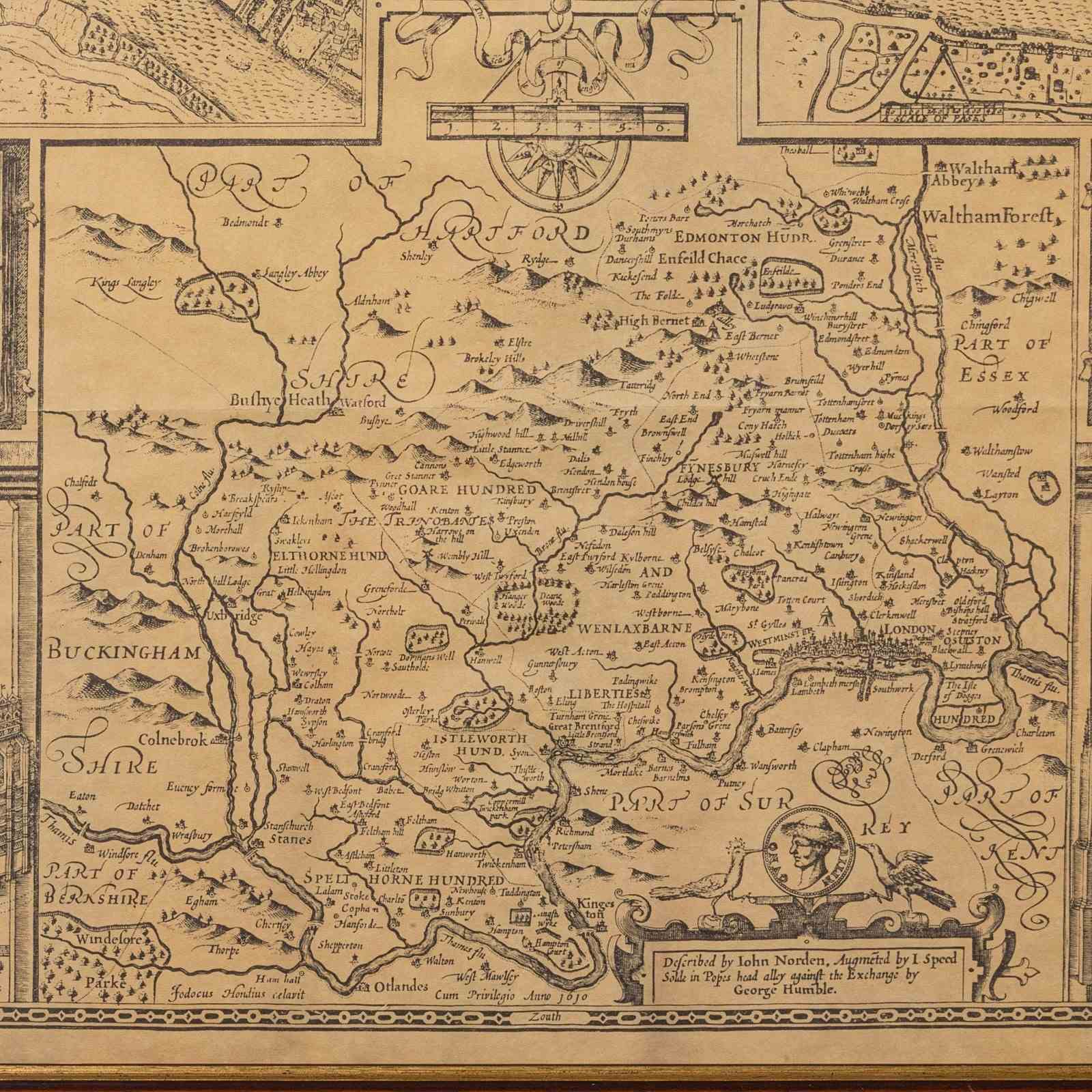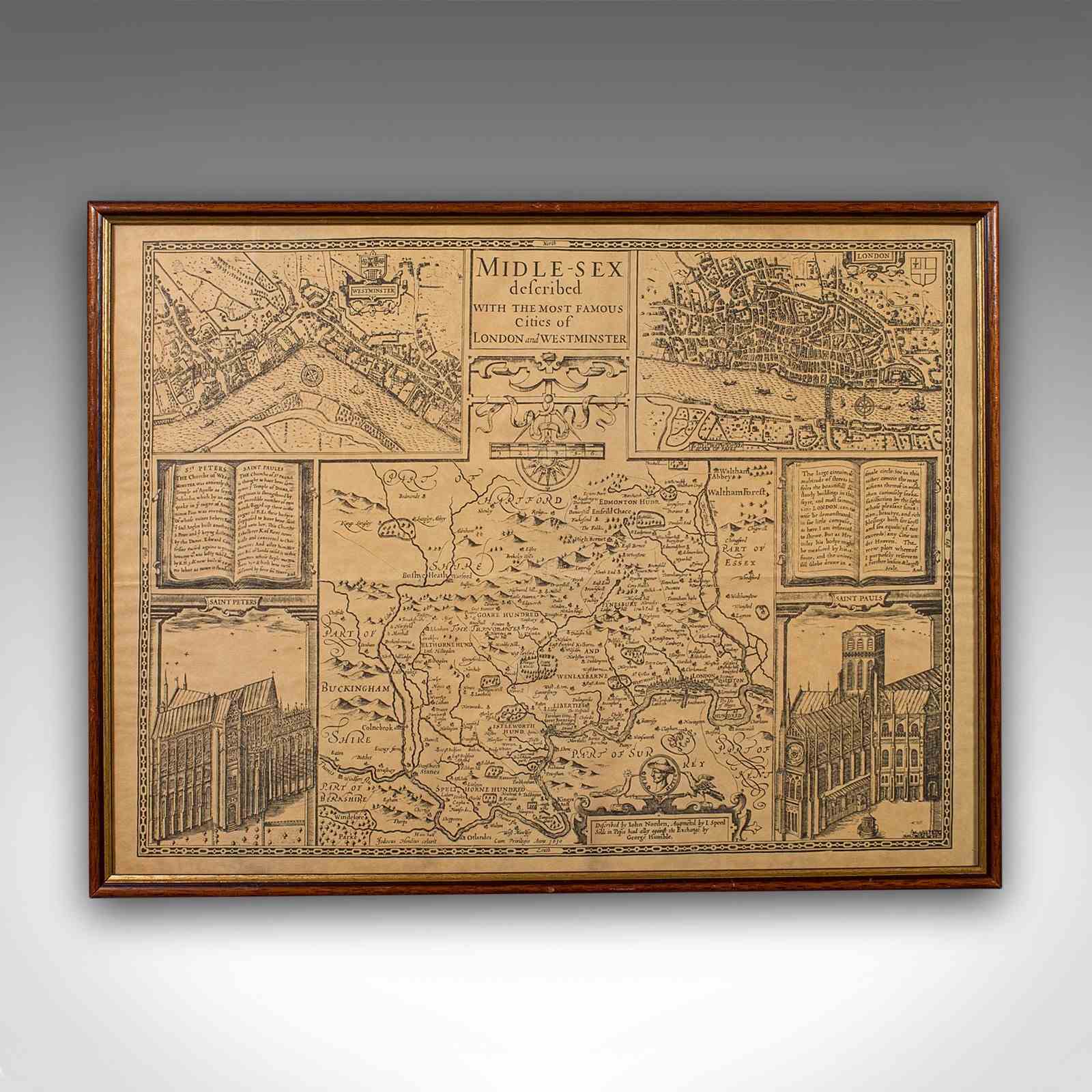 This is a vintage county map of Middlesex. An English, framed reproduction of the 16th century original by John Norden, dating to the late 20th century, circa 1980. A fascinating recreation of the historic 1595 engraving, capturing the Elizabethan-era geography of Middlesex and London in fine detail.