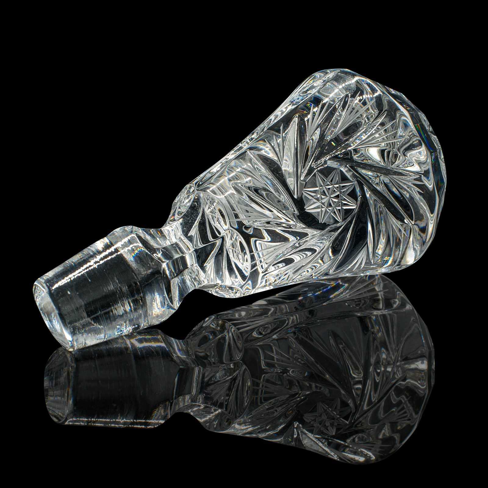This is a distinguished mid 20th century brandy decanter, showcasing exquisite English cut glass craftsmanship, circa 1960. This vintage decorative spirit vessel boasts a distinctive form with intricate detailing, perfect for refined home bars and elegant entertaining.