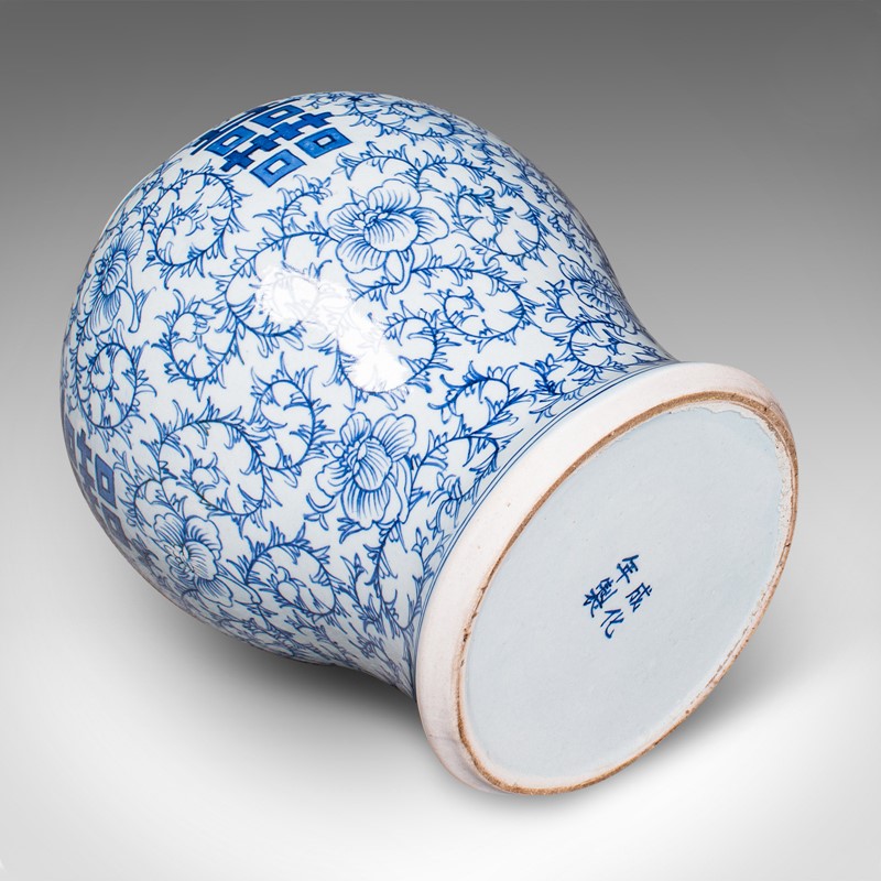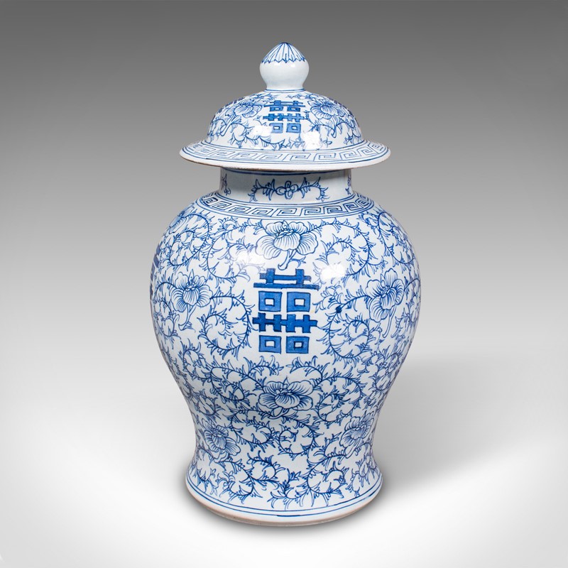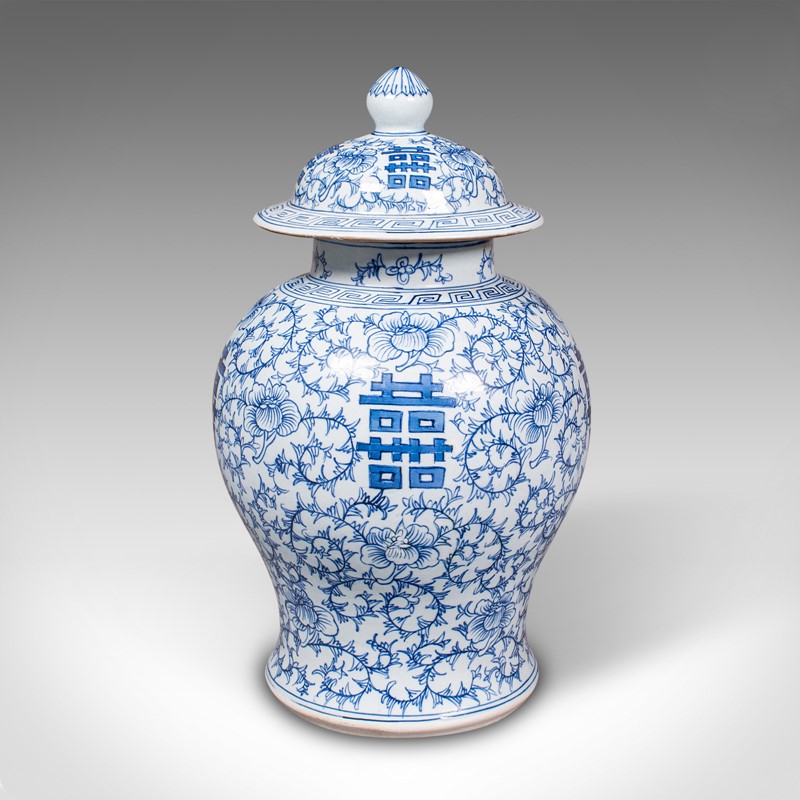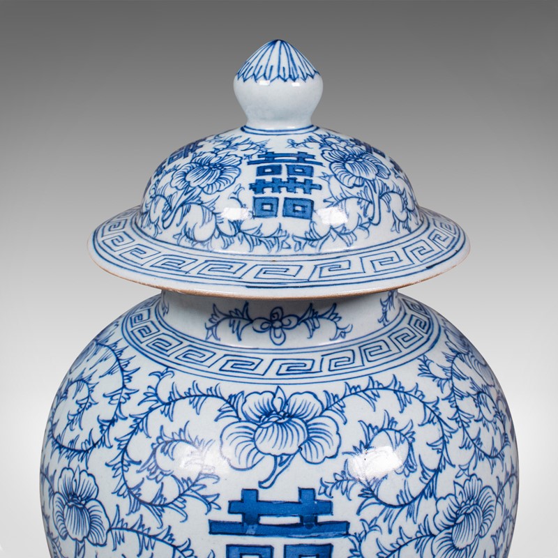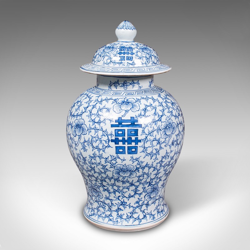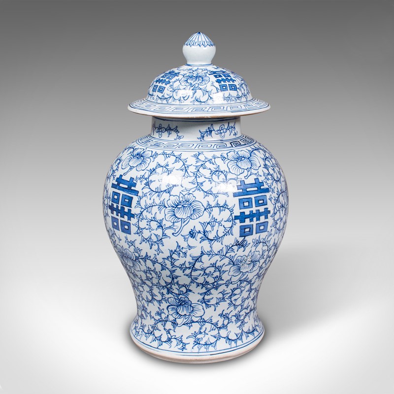 This is a vintage decorative flower vase. A Chinese, ceramic lidded urn, dating to the Art Deco period, circa 1930.