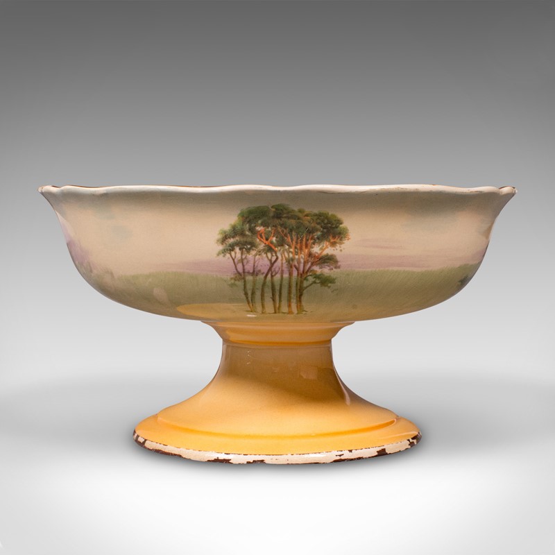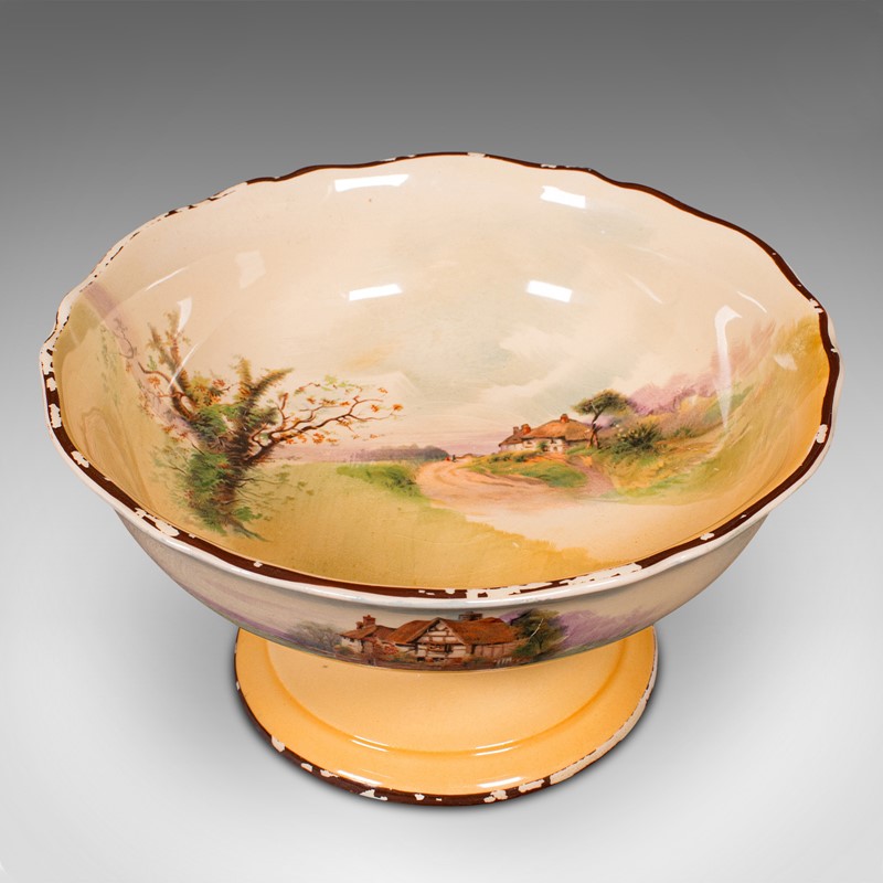 This is a vintage decorative footed bowl. An English, ceramic serving dish, dating to the early 20th century, circa 1930.