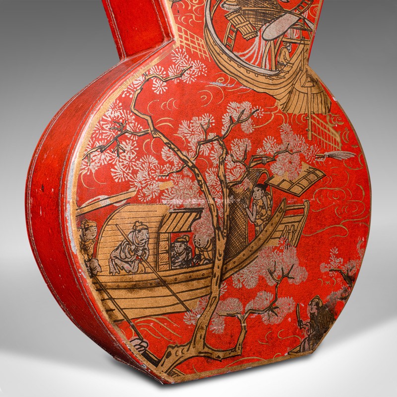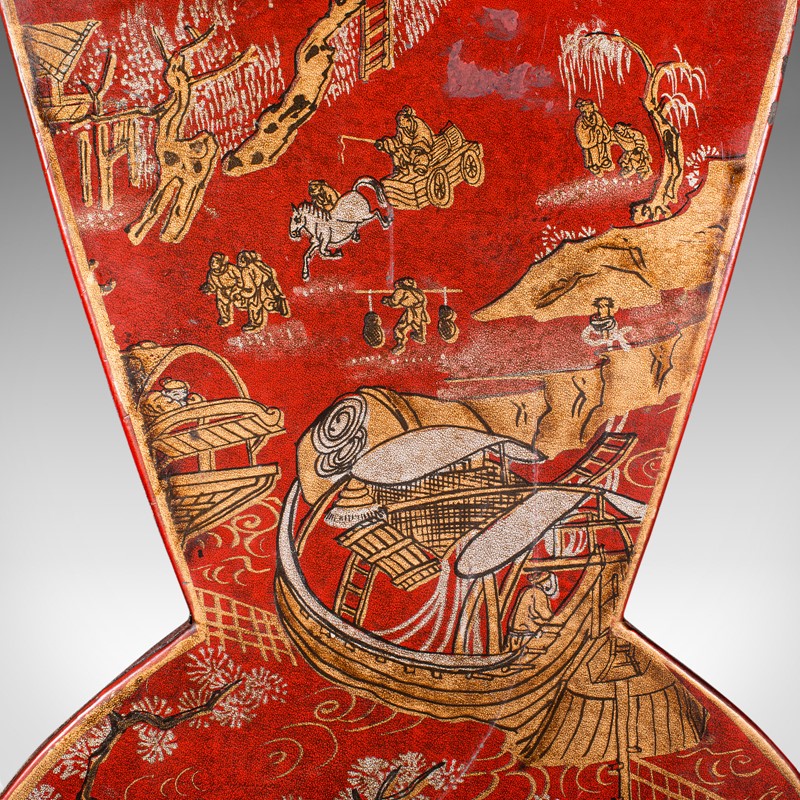 Decorative river scenes adorn the unusual form, with black and gold finish