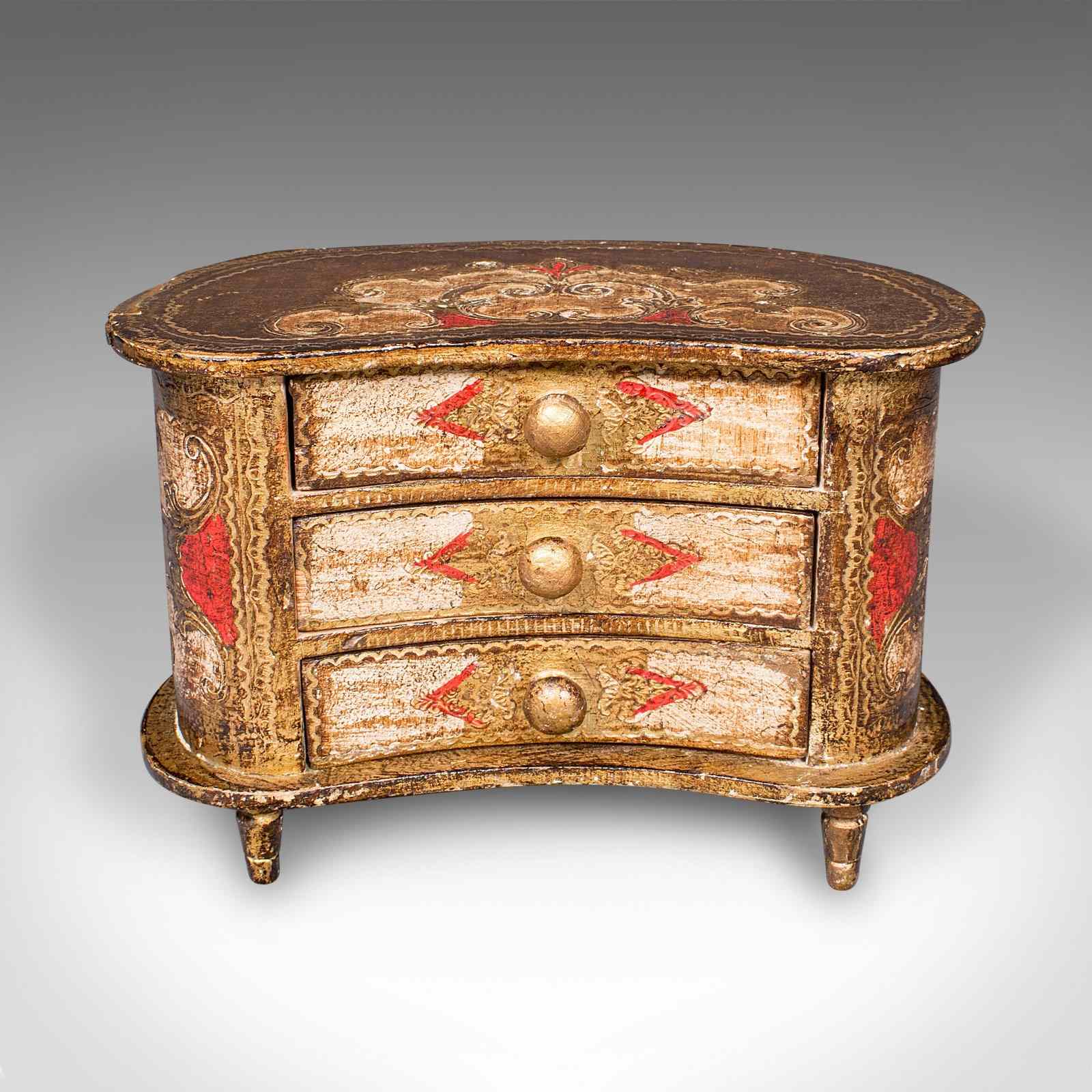 This is a small vintage Florentine jewellery box. An Italian, giltwood apprentice chest of drawers, dating to the mid 20th century, circa 1960. With a delightful Italianate finish, this charming small case is ideal for storing trinkets, keepsakes, or jewellery.