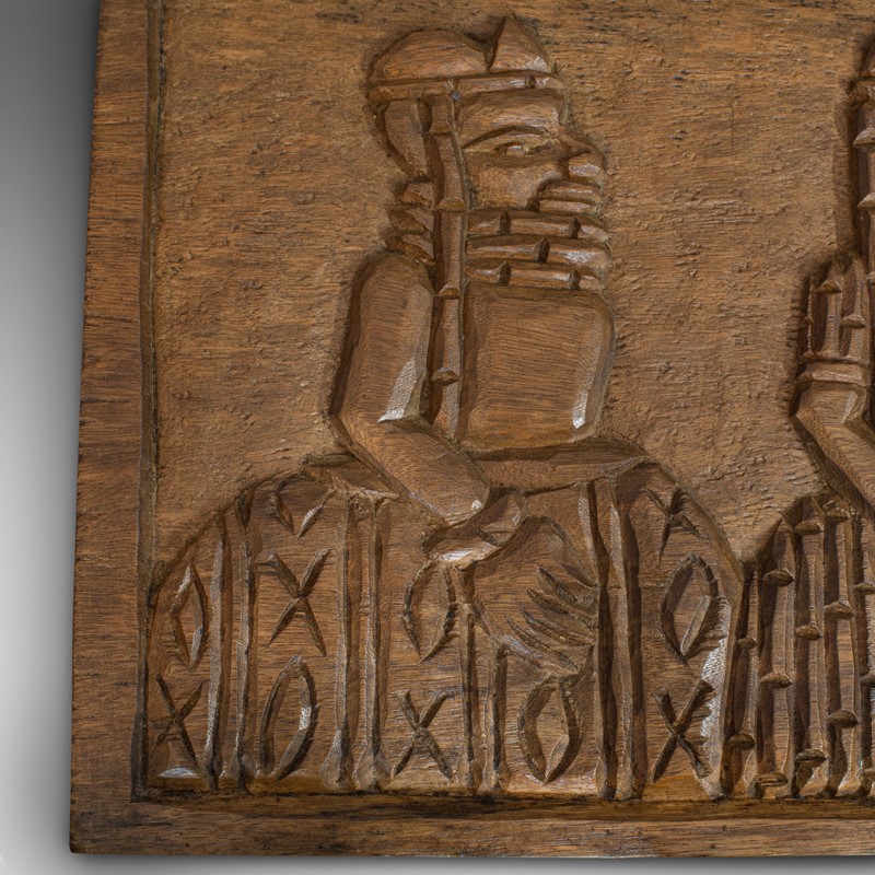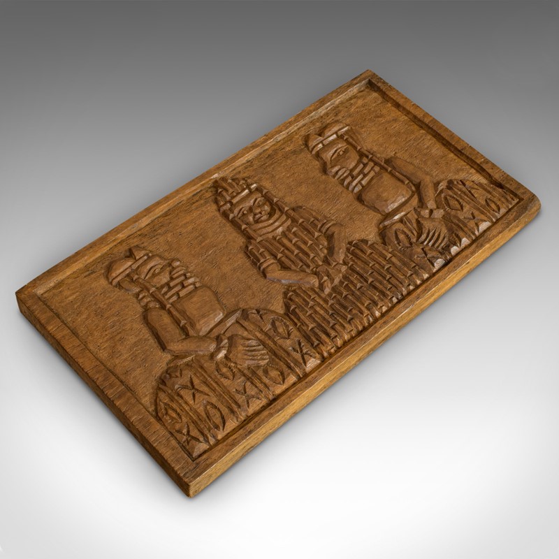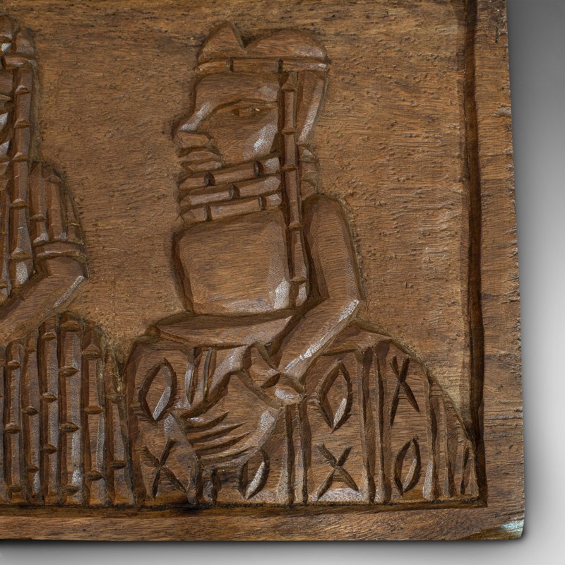 This is a vintage hand carved wooden plaque. An Asian hardwood, naive decorative tribal scene, dating to the early 20th century.