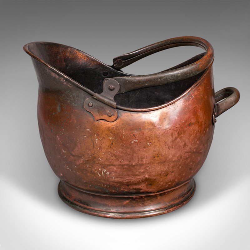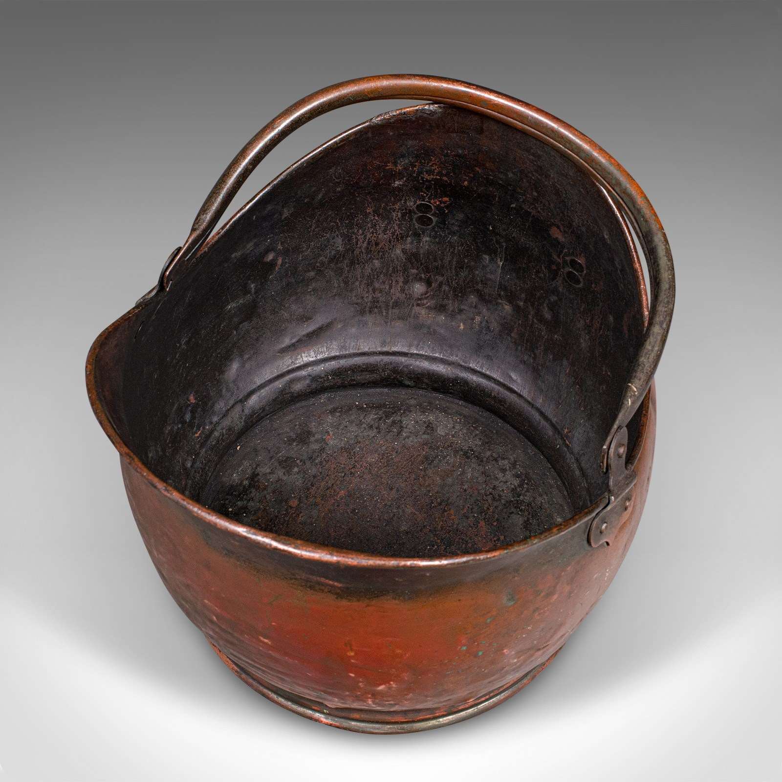 This is a vintage coal scuttle. An English, copper helmet fuel basket in Victorian revival taste, dating to the mid 20th century, circa 1950. A classically styled piece, it brings a touch of Victorian fireplace charm to any home.