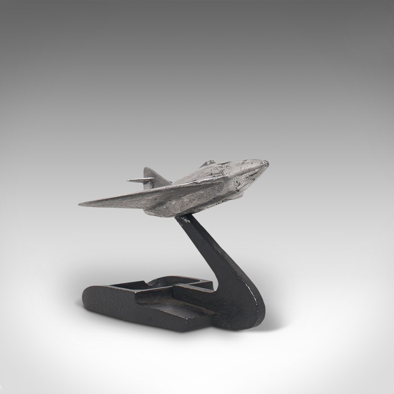 This is a vintage jet plane on stand. An English, cast alloy decorative desk ornament, dating to the early days of the jet age in the mid 20th century, circa 1960.