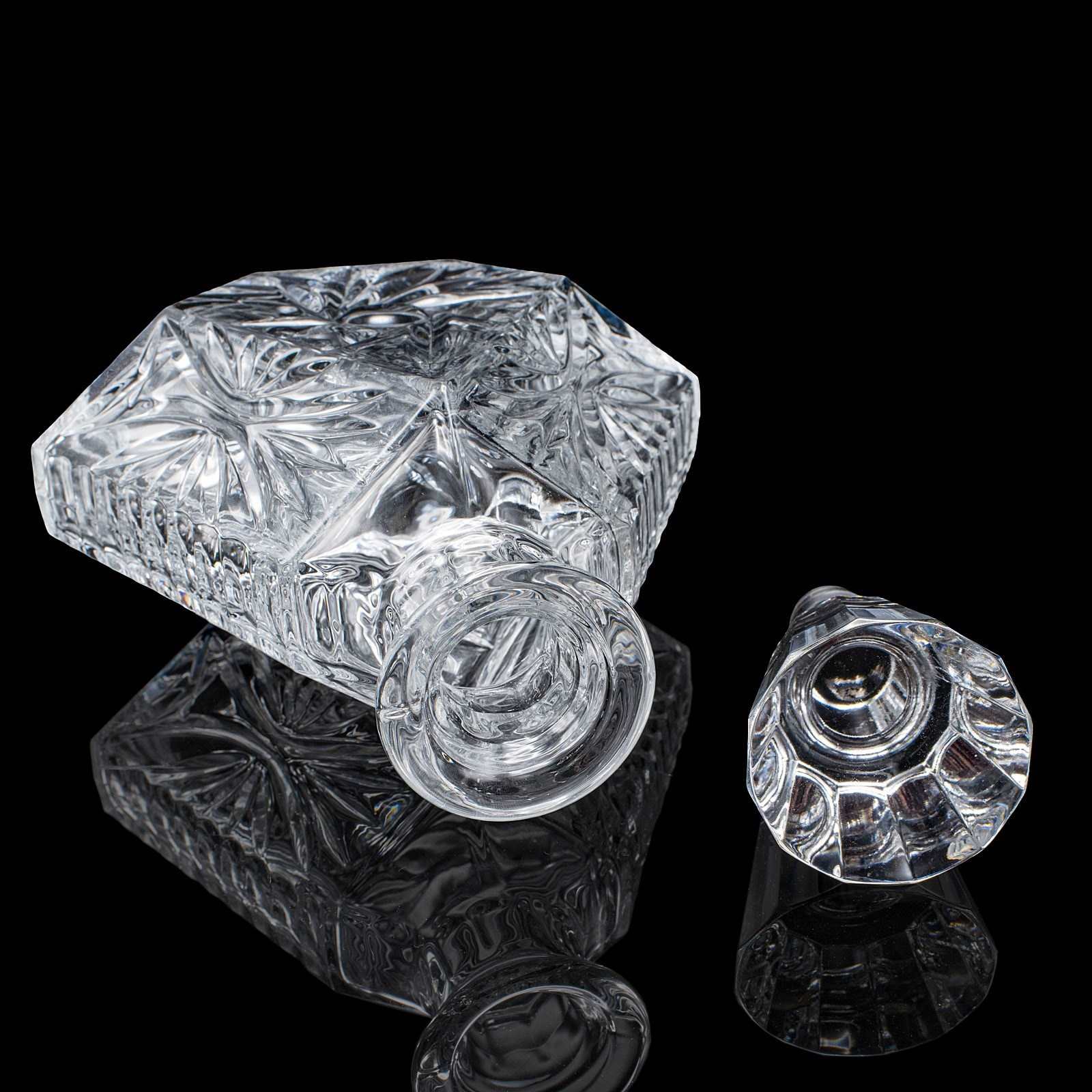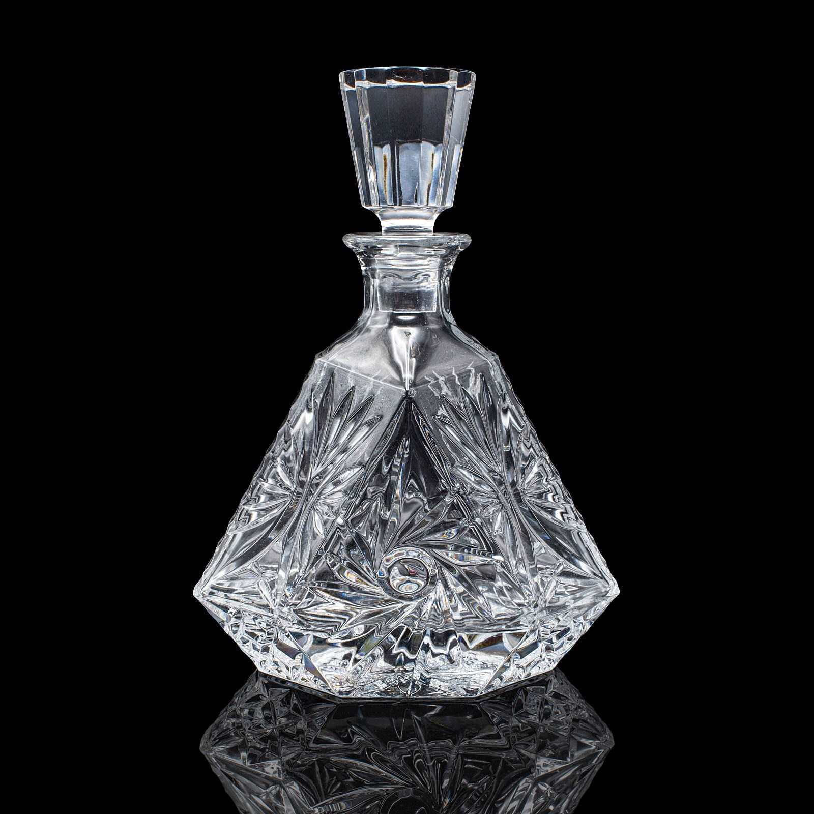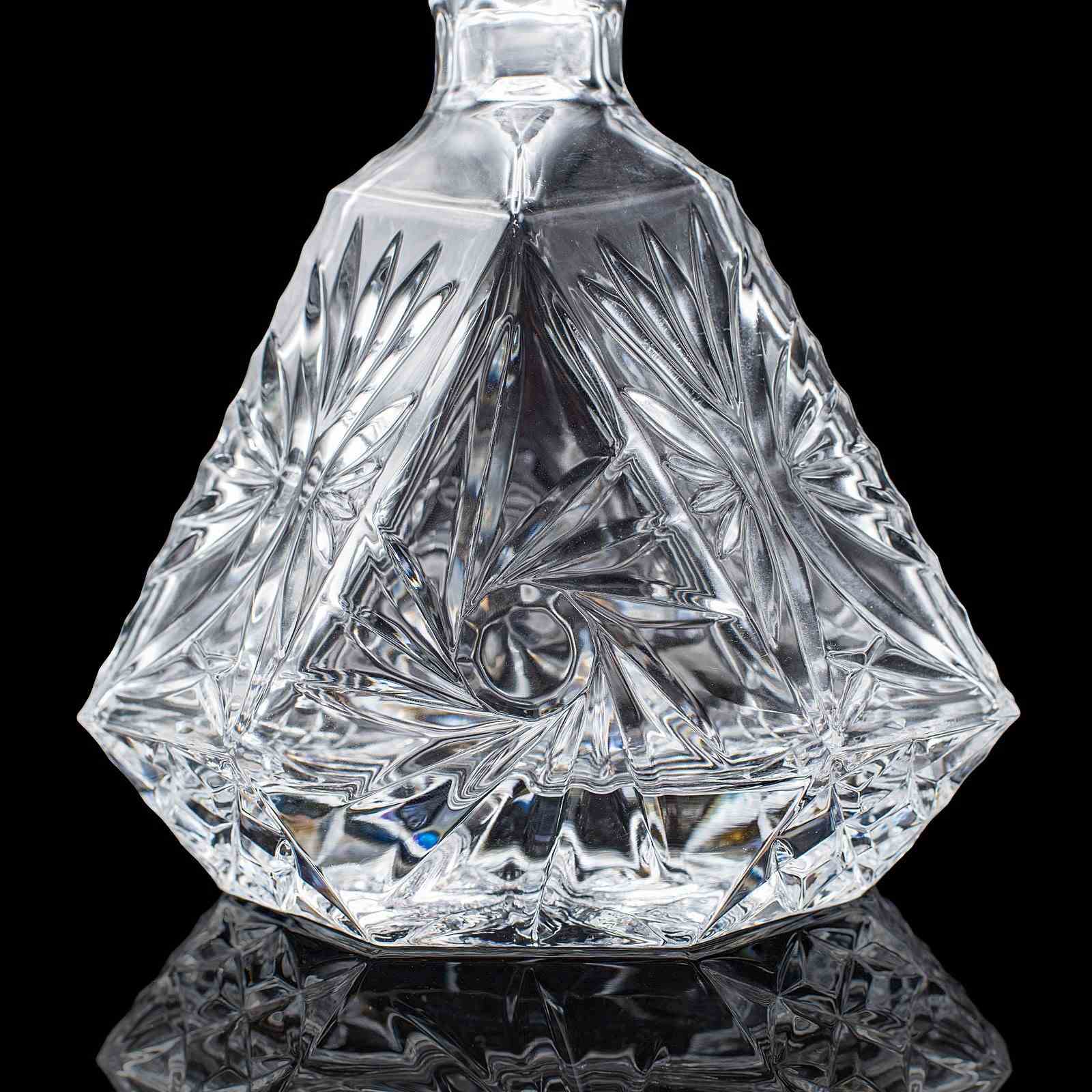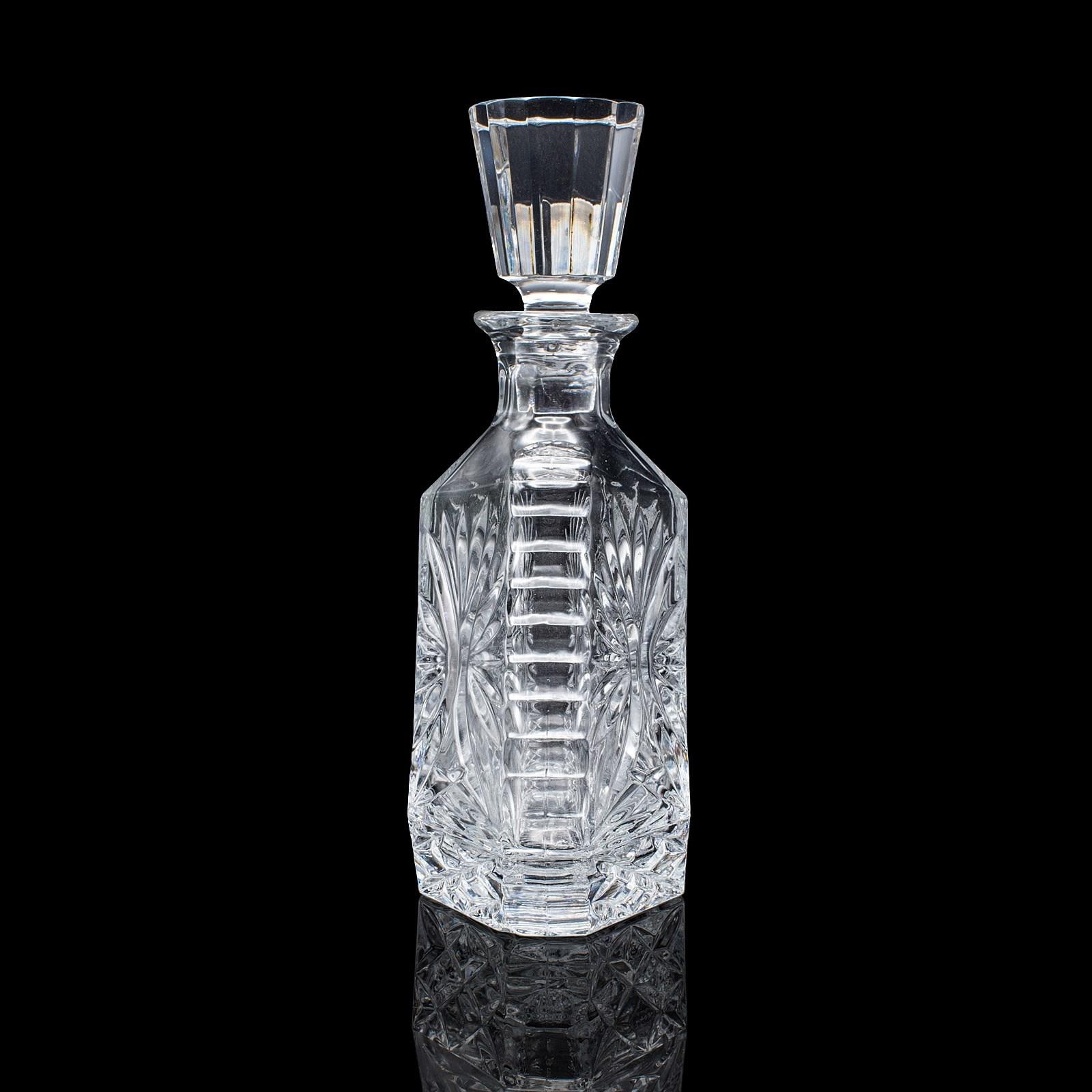 This is a vintage liqueur decanter. An English, cut crystal glass spirit bottle, dating to the late 20th century, circa 1970. A distinctive and eye-catching decanter, with bold geometric form and crisp cut detail.