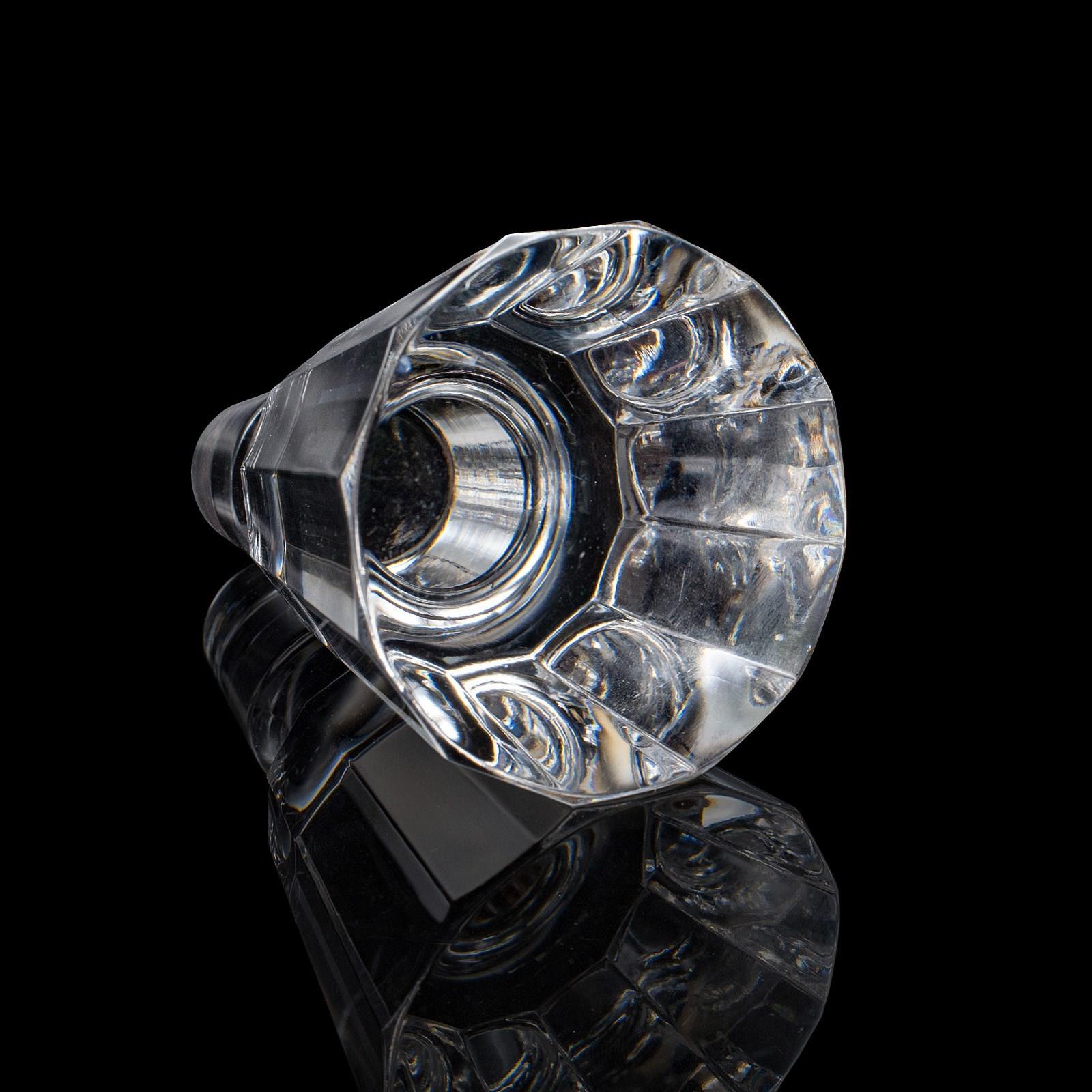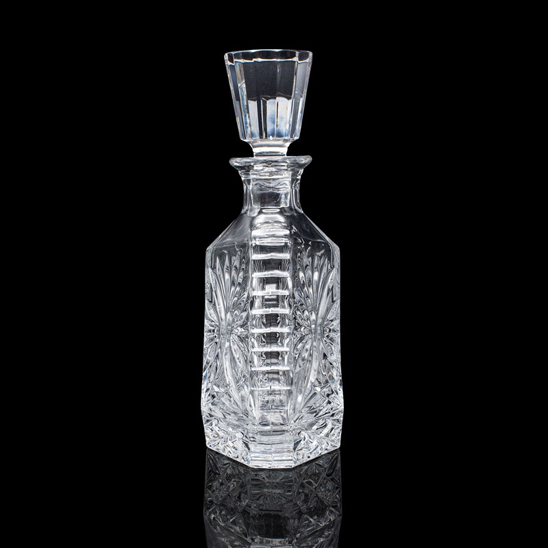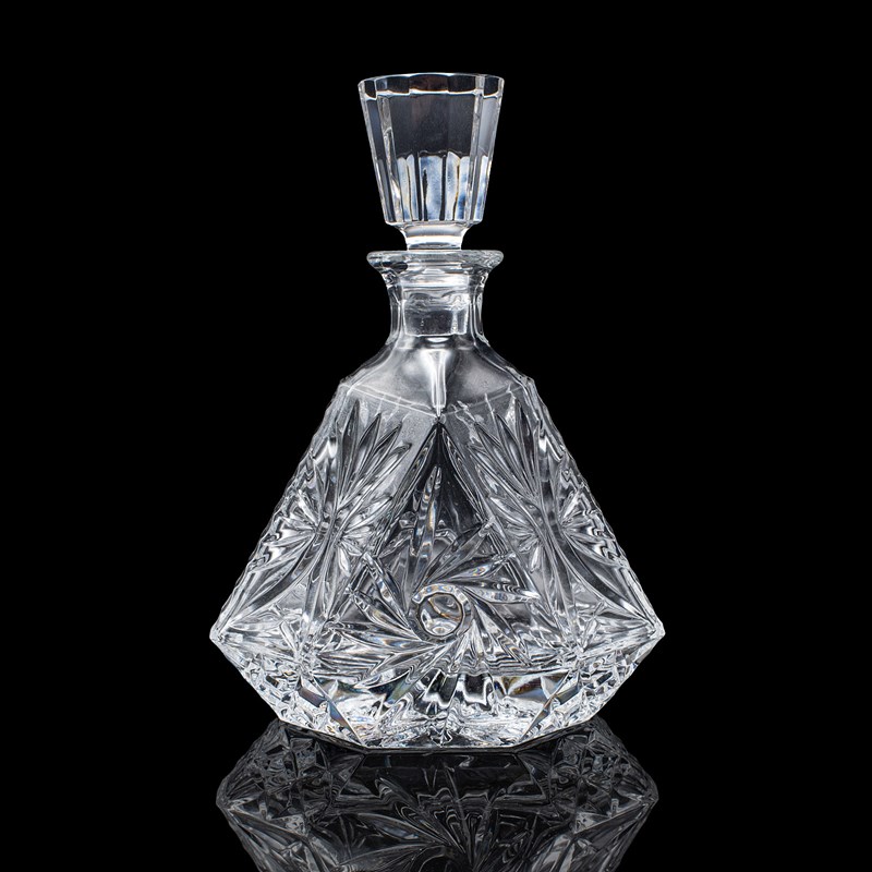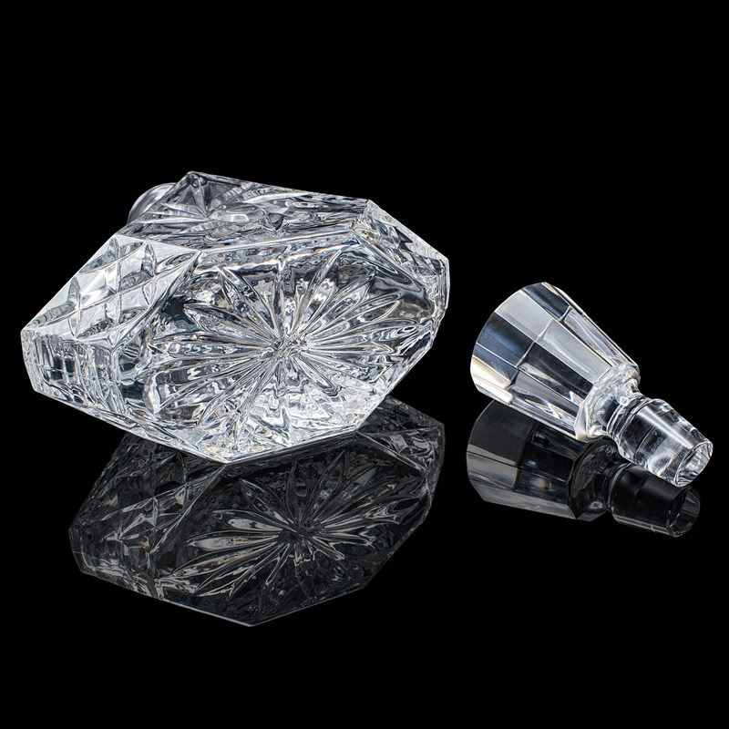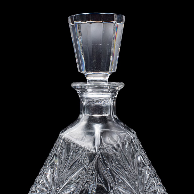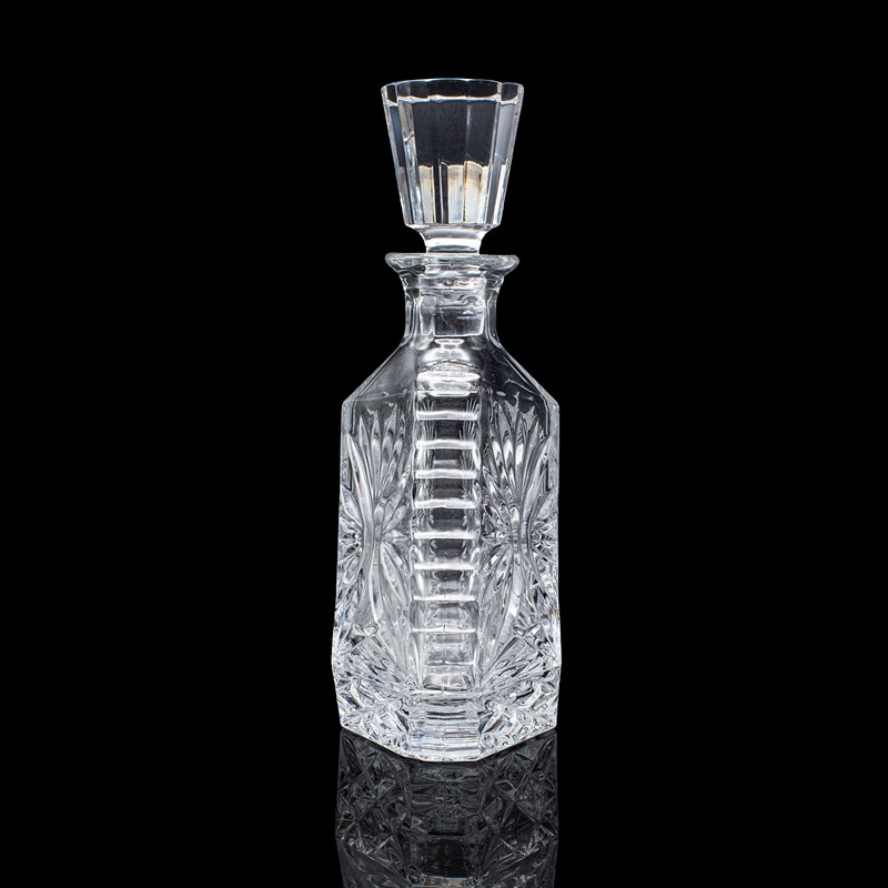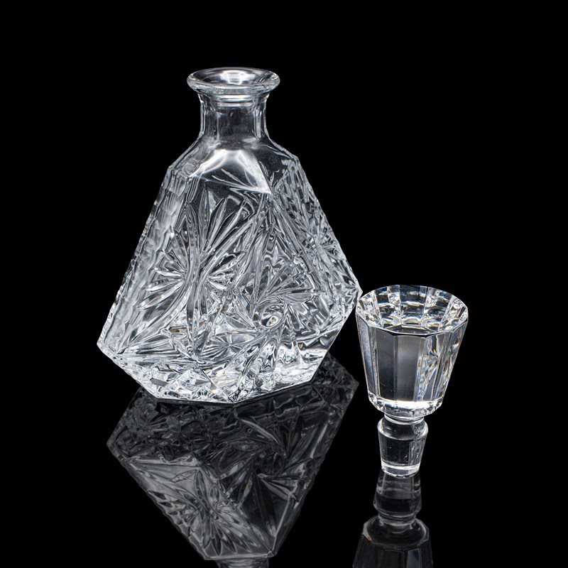 This is a vintage liqueur decanter. An English, cut crystal glass spirit bottle, dating to the late 20th century, circa 1970. A distinctive and eye-catching decanter, with bold geometric form and crisp cut detail.