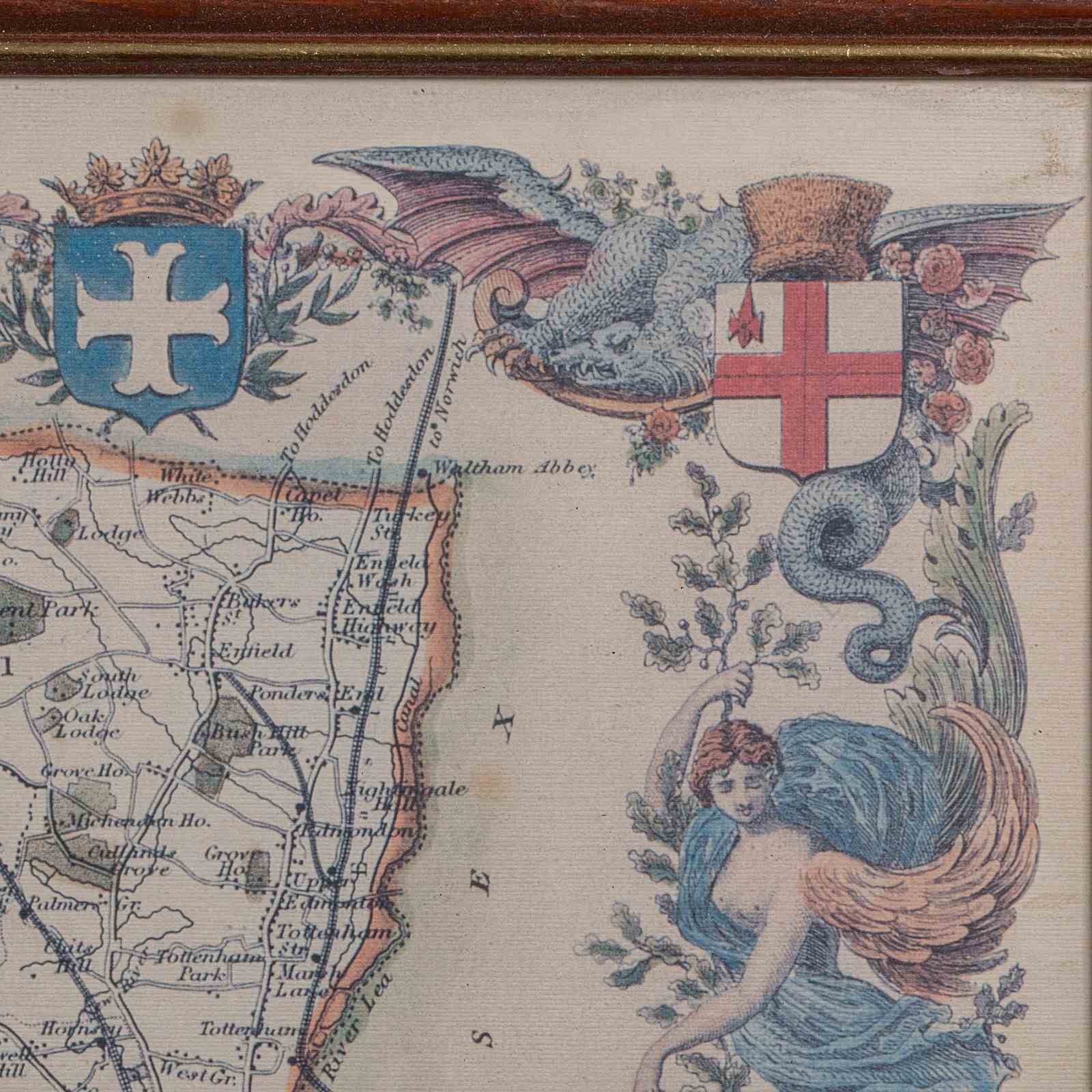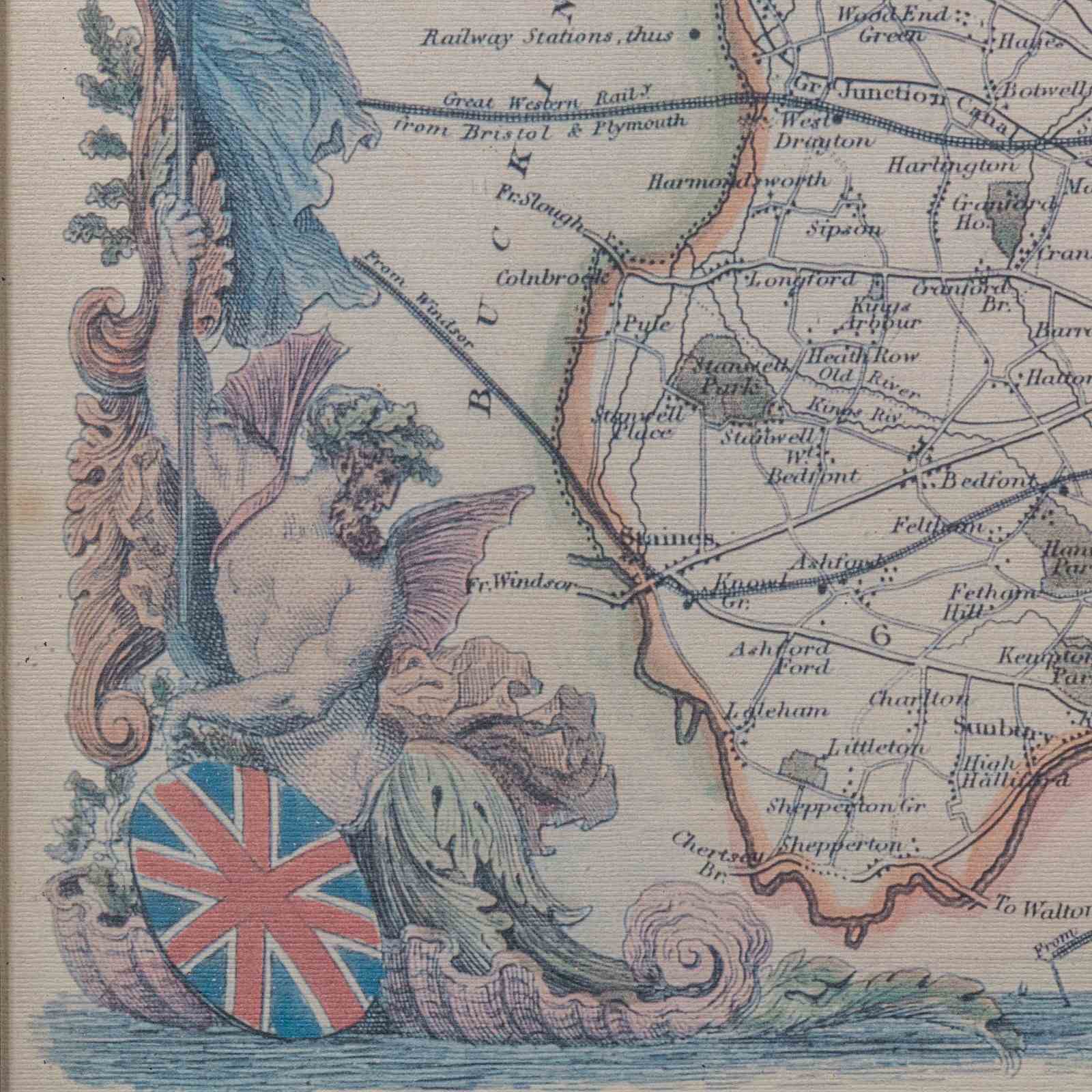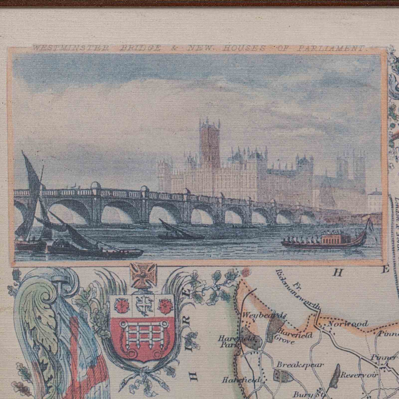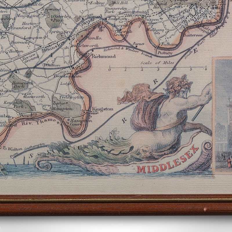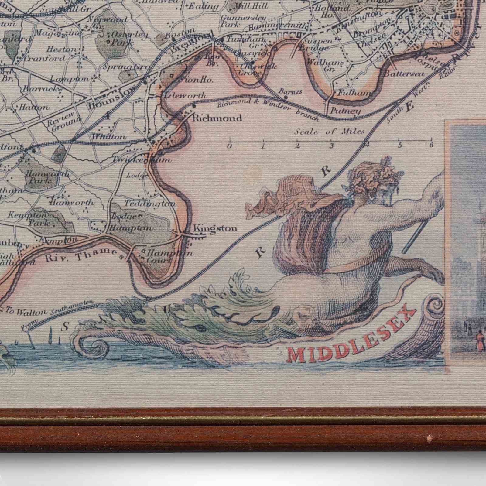 This is a vintage Middlesex county map. An English, framed reproduction of the 19th century original by Thomas Moule (1784 - 1851), dating to the late 20th century, circa 1980. A quality reproduction capturing the decorative charm and intricate detail of Moule’s celebrated cartographic work.