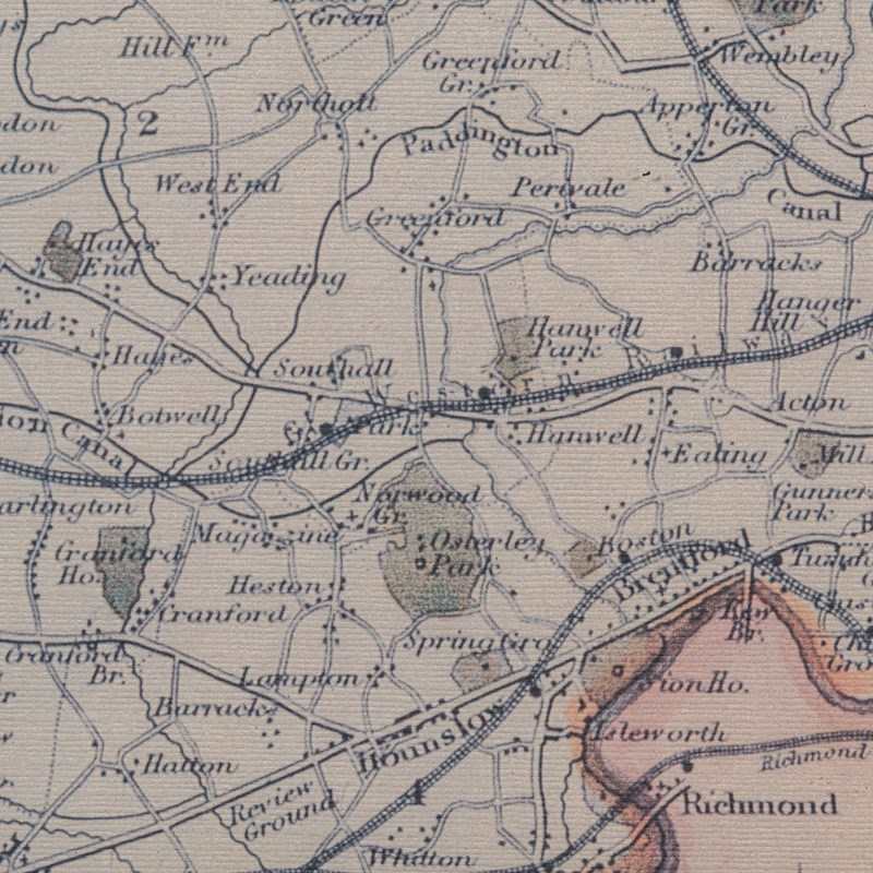 Depicts the county of Middlesex in period, complete with administrative hundreds, rail routes, and London’s urban sprawl