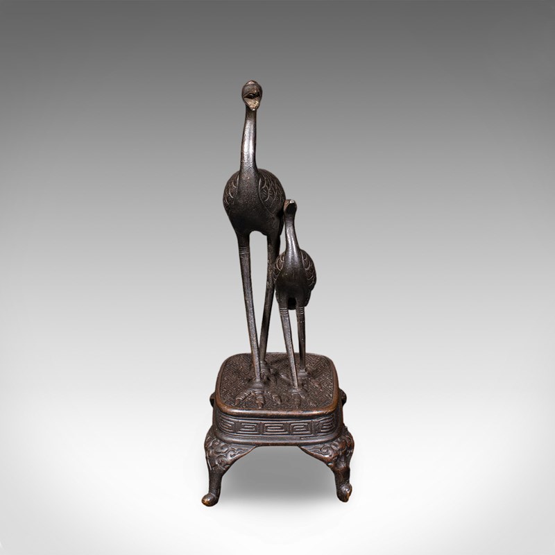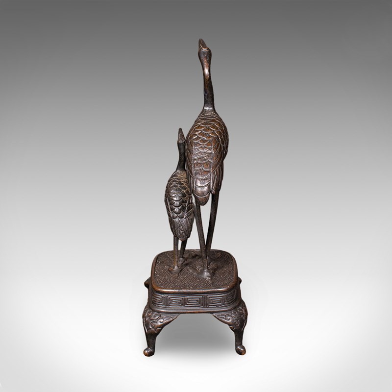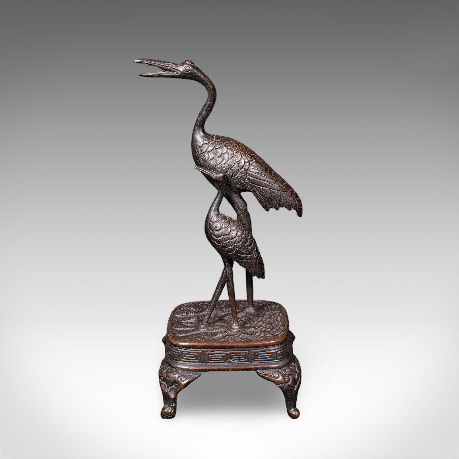 This is a vintage Okimono of two cranes. A Japanese, decorative bronze bird figure, dating to the Art Deco period, circa 1940. A charming decorative study, presenting a mother and chick pairing with appealing detail and traditional Oriental character.